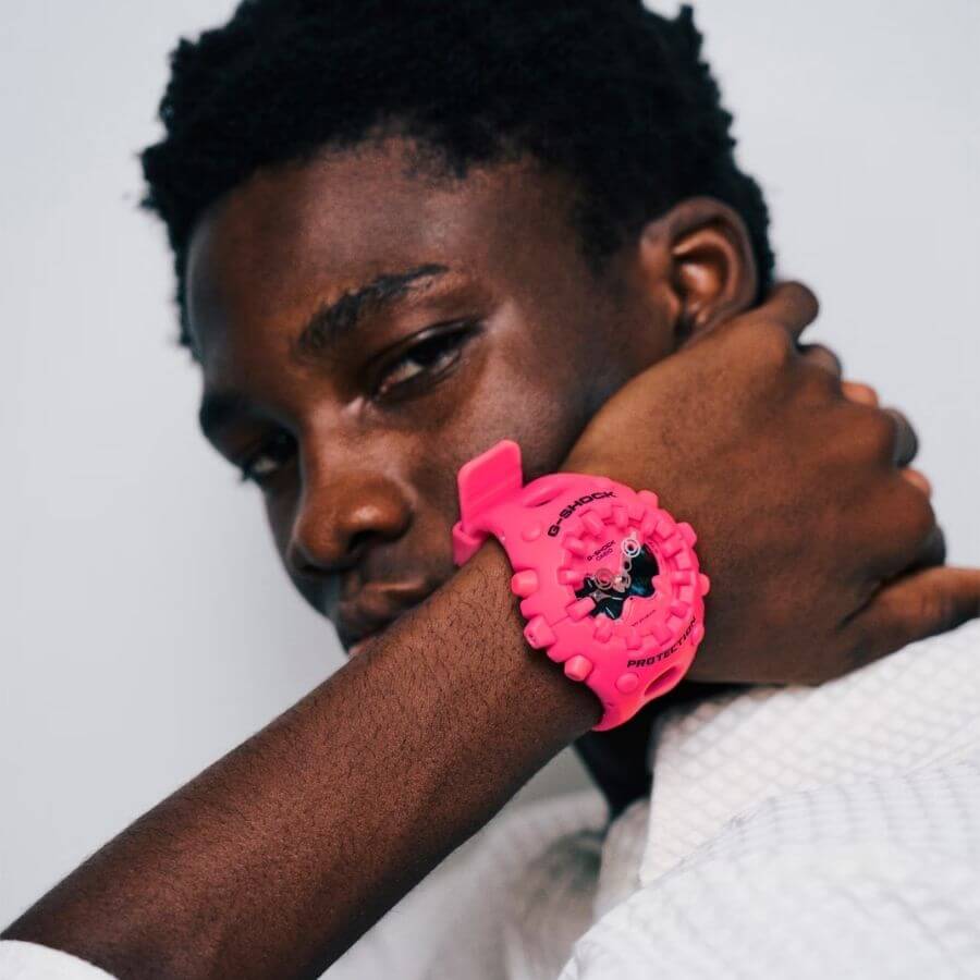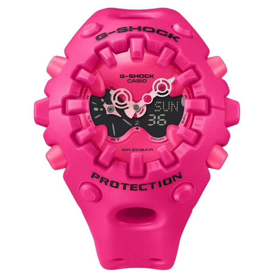 Casio GA-V01-4AER erottuu erityisesti eloisalla pinkillä värillään ja mattapintaisella viimeistelyllä, joka tekee siitä rohkean tyylivalinnan. Kellon suuri täysnäyttöinen LCD-näyttö ja metallinhohtoinen taulu luovat syvyyttä ja dynaamisuutta, kun taas isot viisarit ja läpinäkyvät yksityiskohdat korostavat kolmiulotteista rakennetta. Innovatiivinen Shock Release Hand -teknologia, jossa viisarit on kiinnitetty magneettisesti, suojaa herkimpiä osia iskuilta ja mahdollistaa entistä näyttävämmän viisarimuotoilun ilman kompromisseja kestävyyden suhteen.