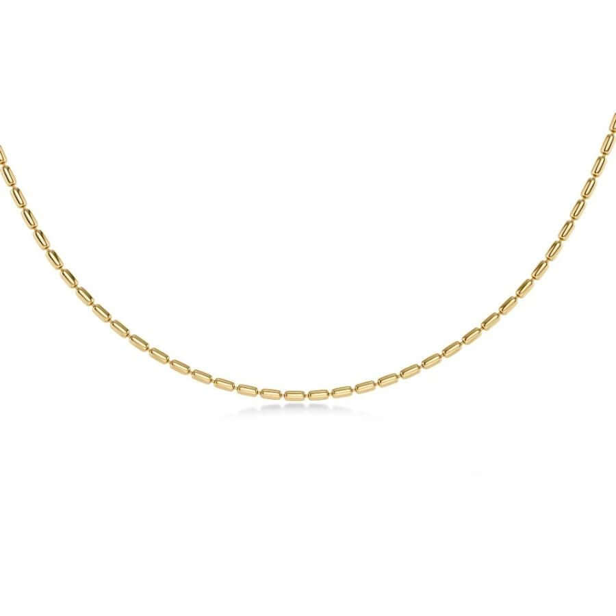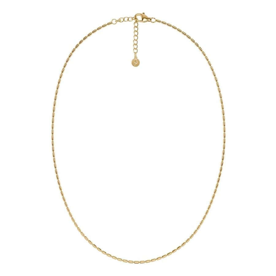 Edblad 130324 kuuluu Seed Bead -sarjaan, jossa muotoilu perustuu suorakaiteen muotoisiin, siemenmäisiin metalliosiin. Tässä kaulakorussa nämä elementit muodostavat rytmikkään ketjun, joka heijastaa valoa kauniisti liikkeen mukana. Kiiltävä 14 karaatin kultaus antaa korulle lämpimän ja ylellisen sävyn, joka sopii erinomaisesti sekä yksinään käytettäväksi että osaksi kerrostettua kaulakorutyyliä. Selkeä ja harmoninen kokonaisuus tekee korusta ajattoman lisän mihin tahansa korukokoelmaan.