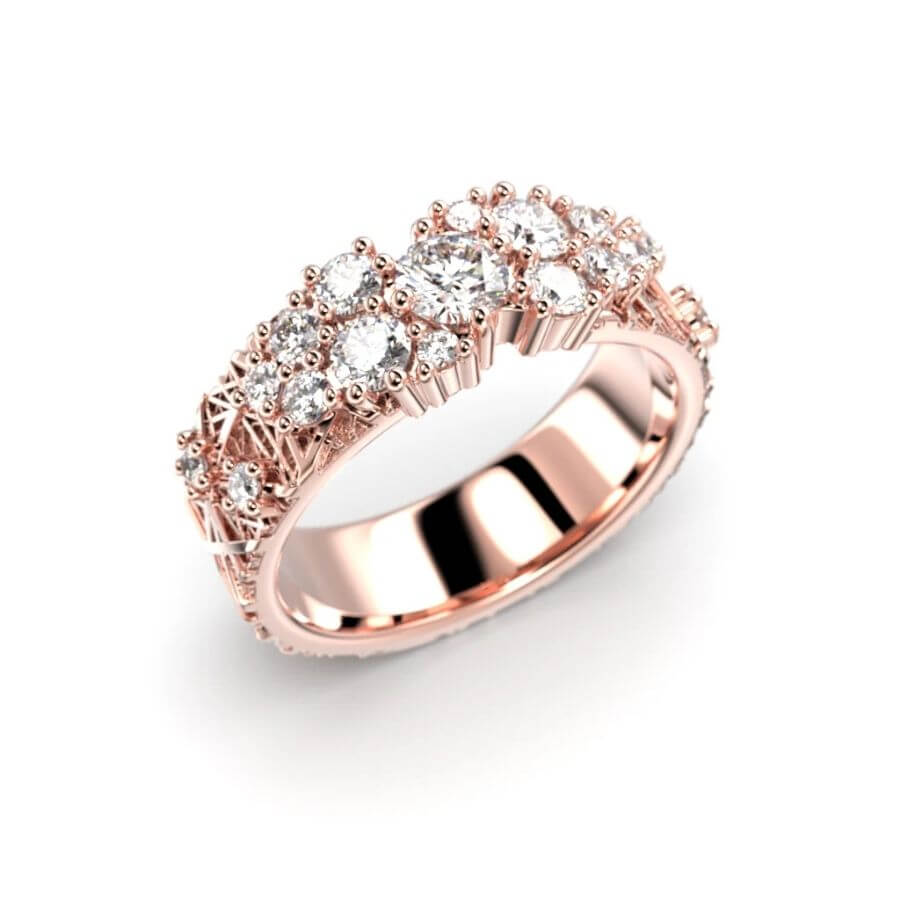 Festive 663-086 erottuu rohkealla ja persoonallisella muotoilullaan. Leveä, flakka-profiilinen runko antaa sormukselle vahvan ja ajattoman ilmeen, kun taas runkoon istutetut usean kokoiset timantit luovat elävää pintaa ja hienostunutta säihkettä. Timanttien orgaaninen sommittelu tekee jokaisesta yksityiskohdasta merkityksellisen ja korostaa Routa-malliston tarinallisuutta. Tämä sormus on suunniteltu erityisesti puolisoiden yhteiseksi sormukseksi ja se toimii kauniisti molemmilla.