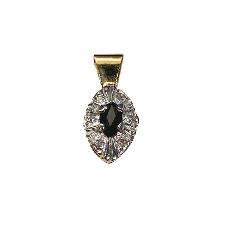 Kaunis kultainen riipus, johon on istutettu keskelle ovaalihiottu sininen safiiri sekä sen ympärille kuusi kimaltavaa briljanttihiottua timanttia.