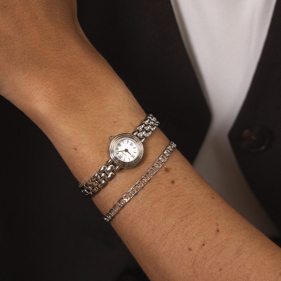 Settiin kuuluva Curb Chain -rannekoru täydentää kellon klassisen ilmeen. Sen ajaton ketjumuotoilu ja hopeanvärinen kiilto tekevät siitä täydellisen parin kellolle – tai elegantin yksityiskohdan sellaisenaan. Rannekoru on valmistettu ruostumattomasta teräksestä ja sen säädettävä pituus (16 + 4 cm) takaa mukavan istuvuuden.