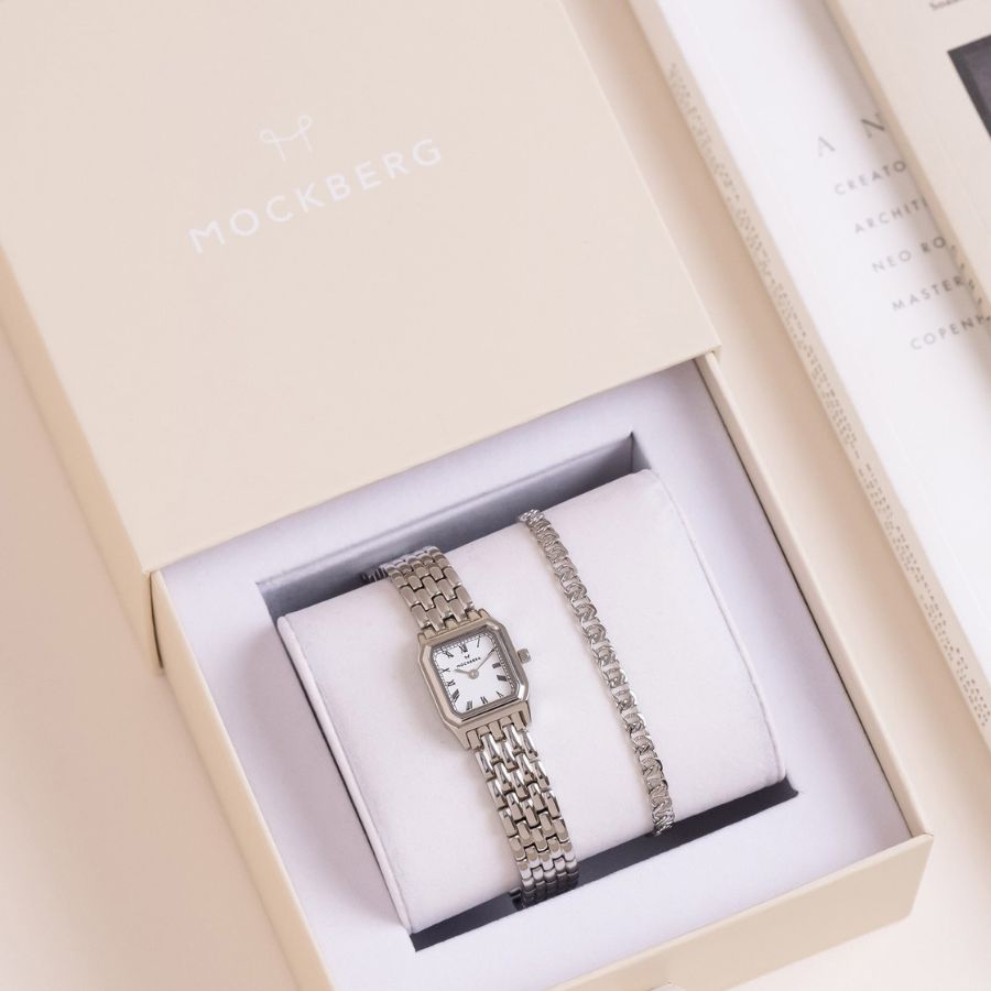 Mockberg MO204 edustaa merkin tunnusomaista minimalistista tyyliä, jossa yhdistyvät selkeät linjat ja hienovarainen naisellisuus. Kellossa on suorakulmainen, ruostumattomasta teräksestä valmistettu kuori ja valkoinen kellotaulu, jota koristavat roomalaiset numerot. Hopeanvärinen linkkiranneke istuu kauniisti ranteessa ja tekee kokonaisuudesta elegantin ja ajattoman. Miyota 5Y30 -kvartsikoneisto takaa tarkan käynnin, ja mineraalilasi suojaa kellotaulua kevyiltä iskuilta ja naarmuilta.