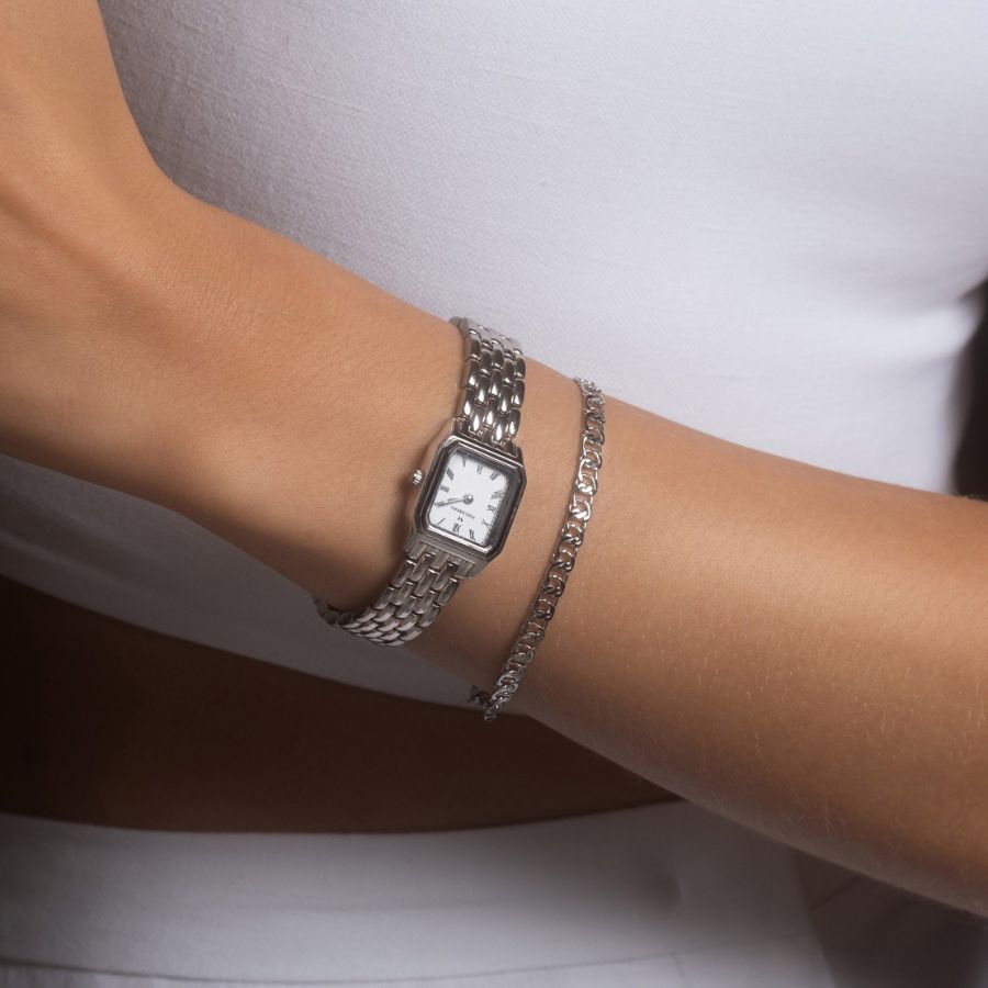 Settiin kuuluva infinity-rannekoru on valmistettu ruostumattomasta teräksestä ja viimeistelty kiiltävällä hopeansävyllä. Sen minimalistinen muotoilu tekee siitä täydellisen parin kellolle – yhdessä ne luovat yhtenäisen, modernin ja tyylikkään vaikutelman.
