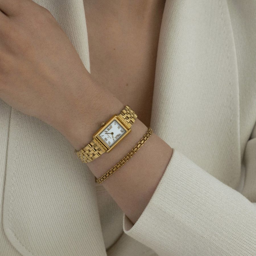 Mockberg MO245 edustaa brändin tunnistettavaa skandinaavista tyyliä, jossa yhdistyvät pehmeät linjat, kultainen sävy ja ajaton estetiikka. Kullatusta ruostumattomasta teräksestä valmistettu suorakulmainen 19 x 28 mm kuori kehystää valkoista kellotaulua, jota koristavat ohuet kultaiset viisarit ja indeksit. Linkkiranneke istuu mukavasti ranteessa ja korostaa kellon siroa ja eleganttia ilmettä. Japanilainen VJ20-kvartsikoneisto varmistaa tarkan ajanpidon, ja mineraalilasi suojaa kellotaulua kevyiltä iskuilta ja naarmuilta.