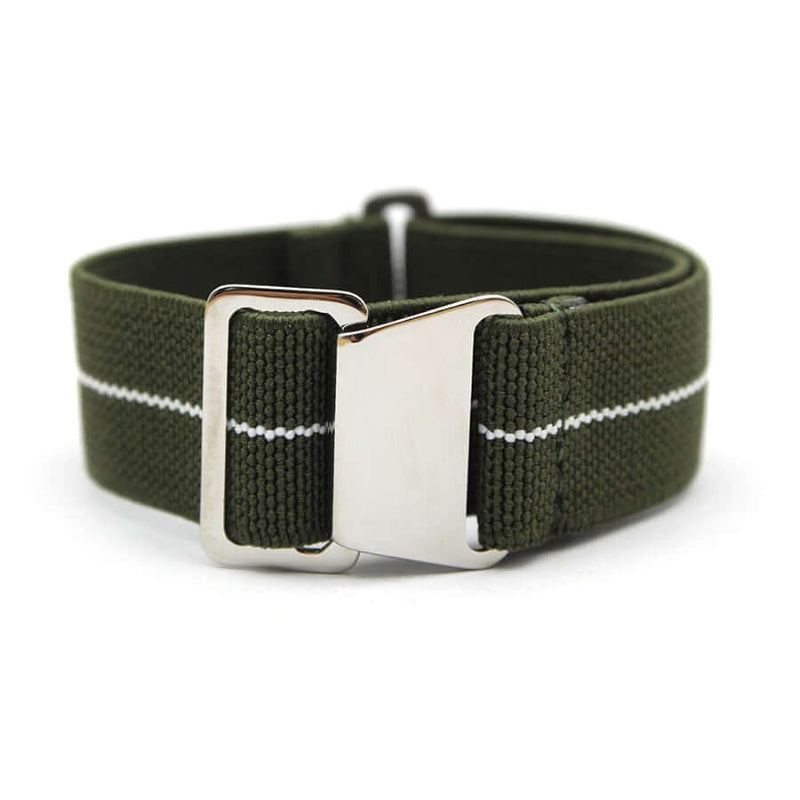 - Tyylikäs armeijanvihreä kellon nato-ranneke, jossa on valkoinen raita.