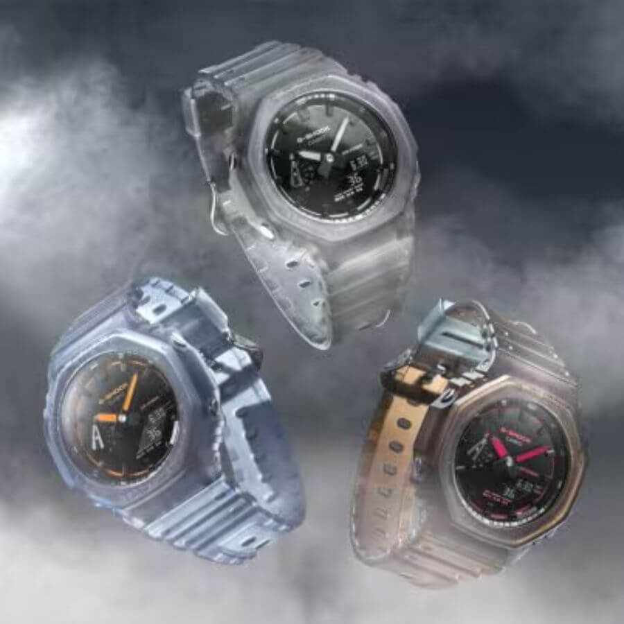 Casio GA-2100K-2AER edustaa GA-2100-sarjan virtaviivaista muotokieltä. Kellotaulun uusi pintaviimeistely on poikkeuksellisen sileä ja antaa syvän, pianonmustan vaikutelman, joka korostaa kellon modernia ilmettä. Läpinäkyvät ja mattapintaiset materiaalit bezelissä ja rannekkeessa tuovat rakennetta ja syvyyttä, samalla kun neonväriset korostukset muistuttavat lasersäteistä savuisella tanssilattialla. Kokonaisuus on harkittu ja ajanmukainen, mutta silti tunnistettavasti G-SHOCK.