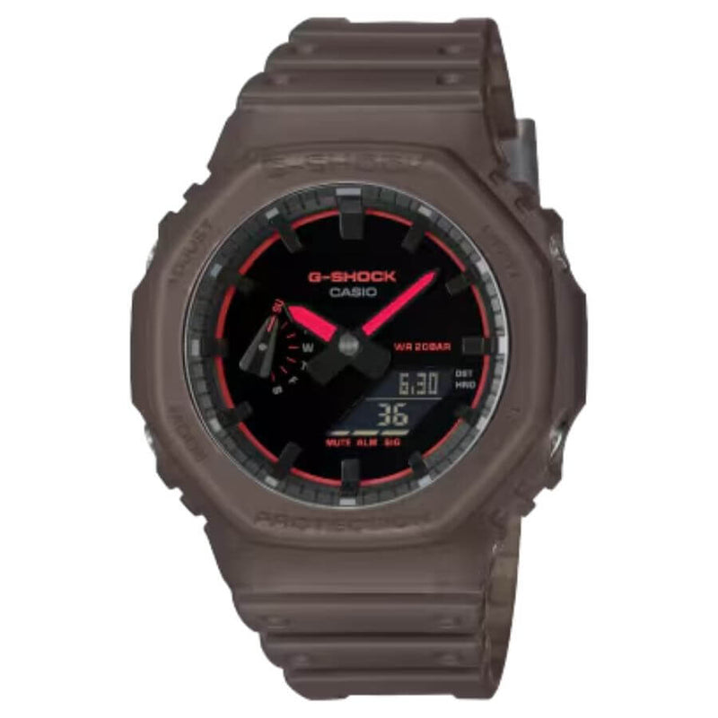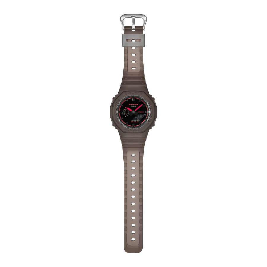 Casio GA-2100K-5AER perustuu GA-2100-sarjan tunnistettavaan, kulmikkaaseen mutta virtaviivaiseen muotoiluun. Kellotaulun uusi sileä pintaviimeistely antaa puhtaan ja modernin ilmeen, joka korostaa mallin syvää ja rikasta värimaailmaa. Ruskean ja tummien sävyjen yhdistelmä tuo kelloon lämpöä ja persoonallisuutta, samalla kun neonhenkiset yksityiskohdat lisäävät siihen modernia energiaa. Bezelissä ja rannekkeessa käytetyt läpikuultavat, mattapintaiset materiaalit luovat hienostunutta tekstuuria ja muistuttavat tanssilattian sumuisesta tunnelmasta.