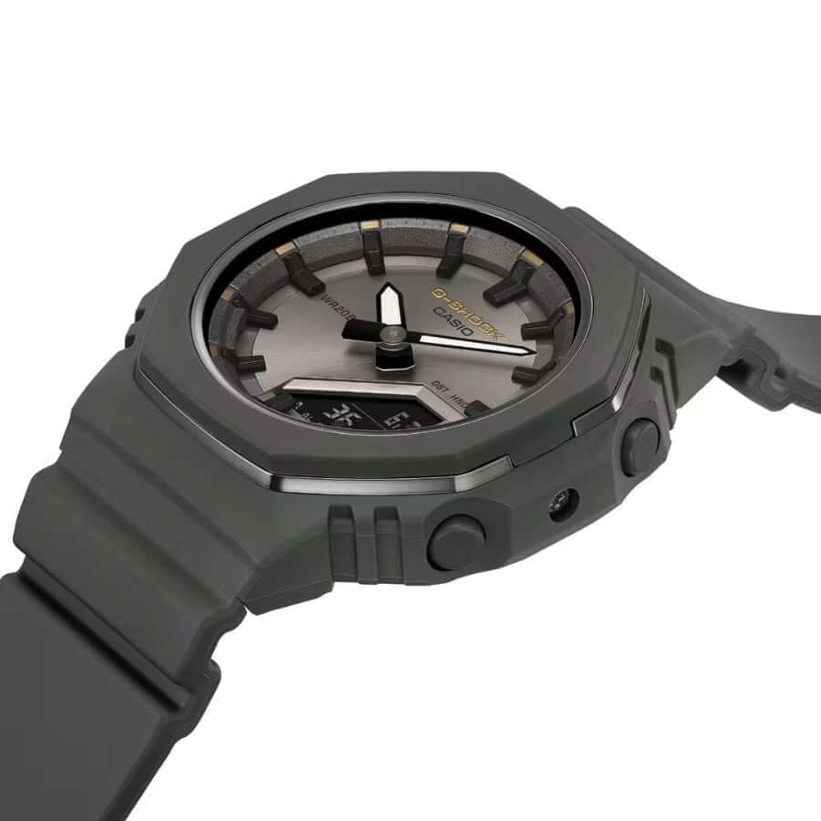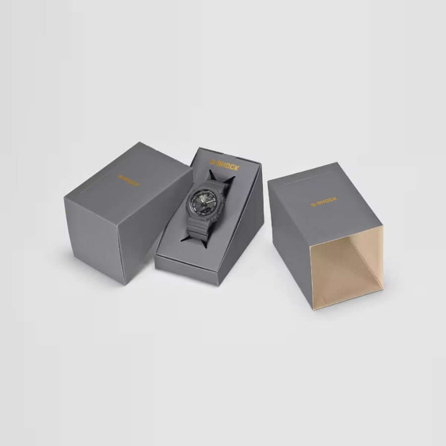 Casio G-Shock GMA-P2126W-8AER perustuu suosittuun ja kompaktin kokoiseen GMA-P2110-designiin. Kellon tummanharmaa värimaailma luo syvyyttä ja modernia ilmettä, jota korostaa metallinen bezel-kehys. Monokromaattiseen sävyyn lisätyt kullanhohtoiset yksityiskohdat symboloivat toivoa ja valoa, jotka murtautuvat esiin harmaan sävyjen keskeltä. Kellotaulun metalliset aksentit viimeistelevät kokonaisuuden tyylikkäällä ja premium-henkisellä säihkeellä. Lopputuloksena on vahva mutta samalla hienostunut kello, joka sopii täydellisesti jokapäiväiseen käyttöön.