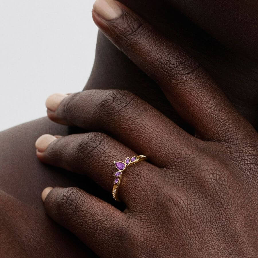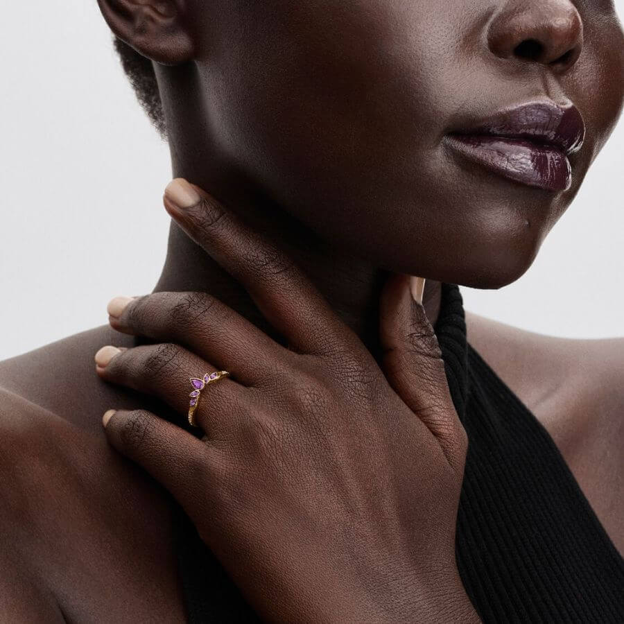 Pandora 164135C01 on valmistettu sterlinghopeasta, joka on päällystetty 14 karaatin kullalla. Sormuksen keskiosaa koristaa pisaranmuotoinen violetti kivi, jota reunustavat pienemmät, lehtimäiset kivet – yksityiskohta, joka tekee korusta kevyen ja sirosti kaartuvan. Kultainen pinta tuo lämpöä ja syvyyttä, kun taas kimaltavat zirkonit lisäävät valoa ja herkkyyttä jokaiseen liikkeeseen.