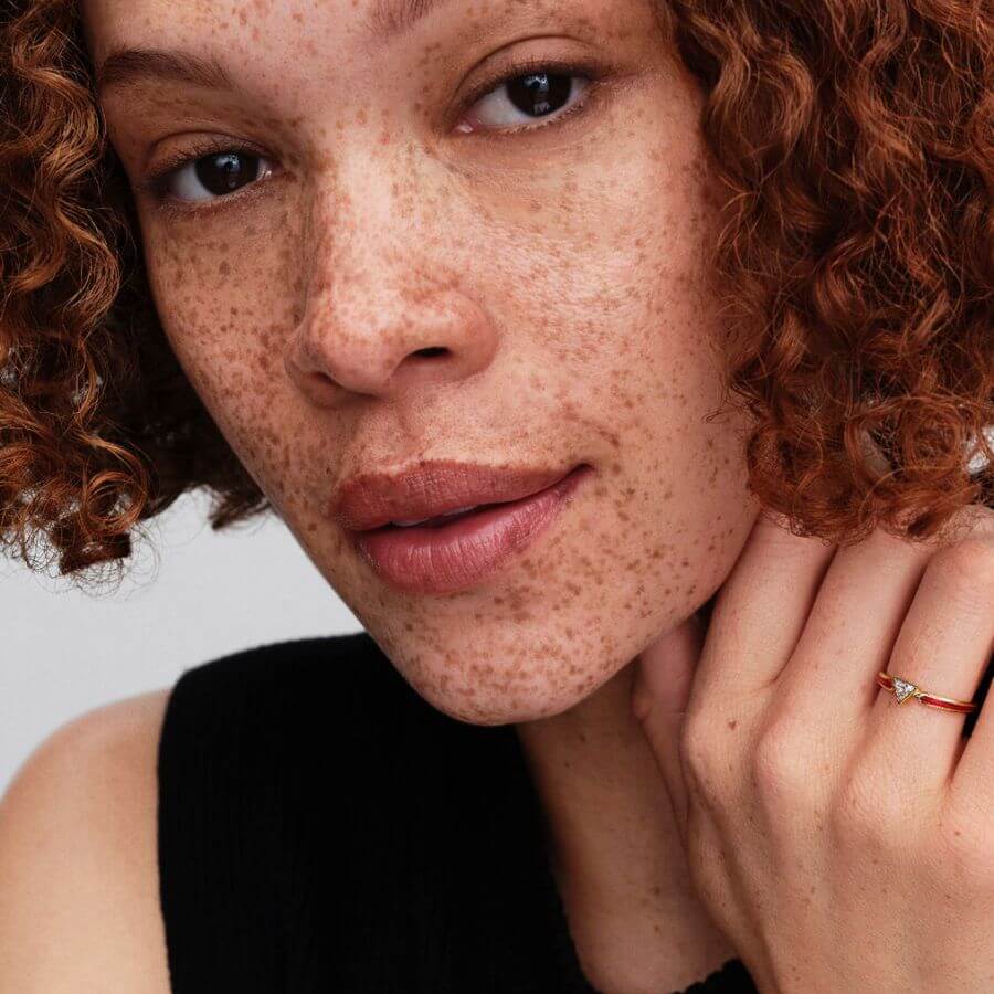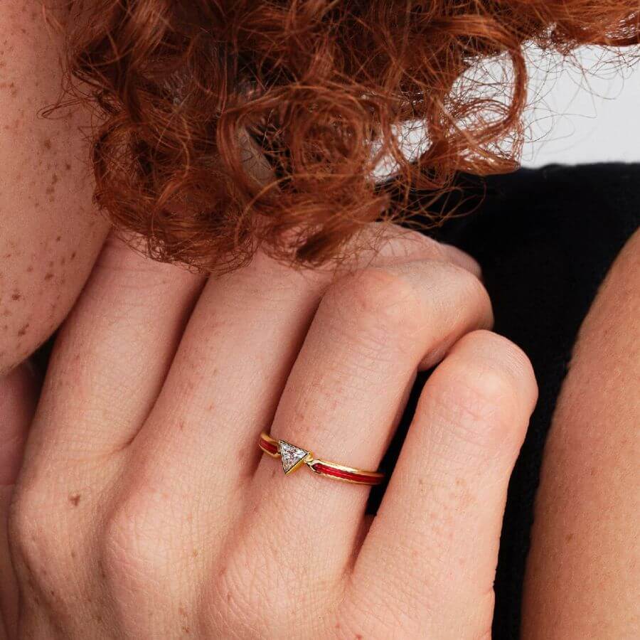 Pandora 164211C01 on valmistettu sterlinghopeasta, joka on päällystetty 14 karaatin kullalla, luoden lämpimän, metallinhohtoisen pinnan. Sormusta koristaa syvänpunainen emaliraita, joka kulkee kauniisti renkaan molemmin puolin. Keskellä loistava kirkas zirkonikivi viimeistelee kokonaisuuden modernilla ja voimakkaalla ilmeellä. Sormuksen sisäpintaan kaiverrettu teksti “Armor Up” muistuttaa käyttäjää sisäisestä vahvuudesta ja rohkeudesta.