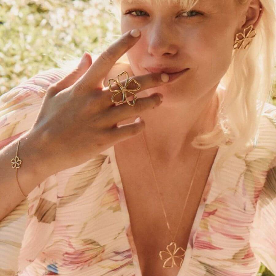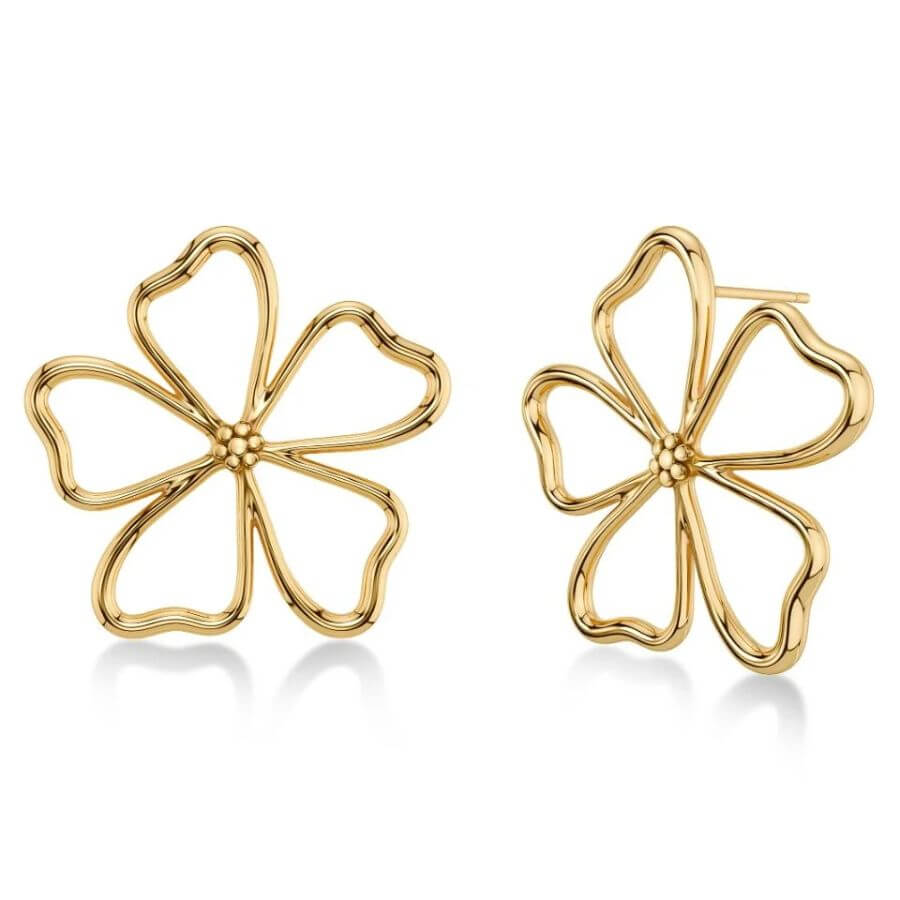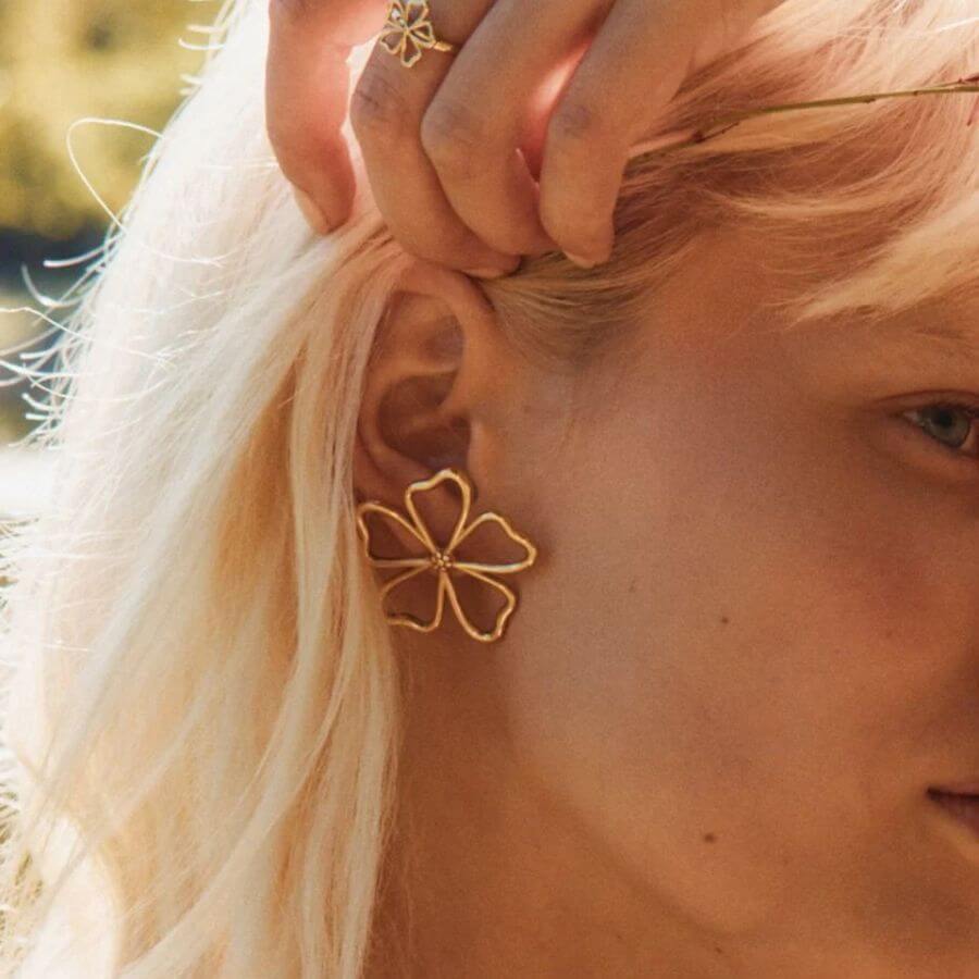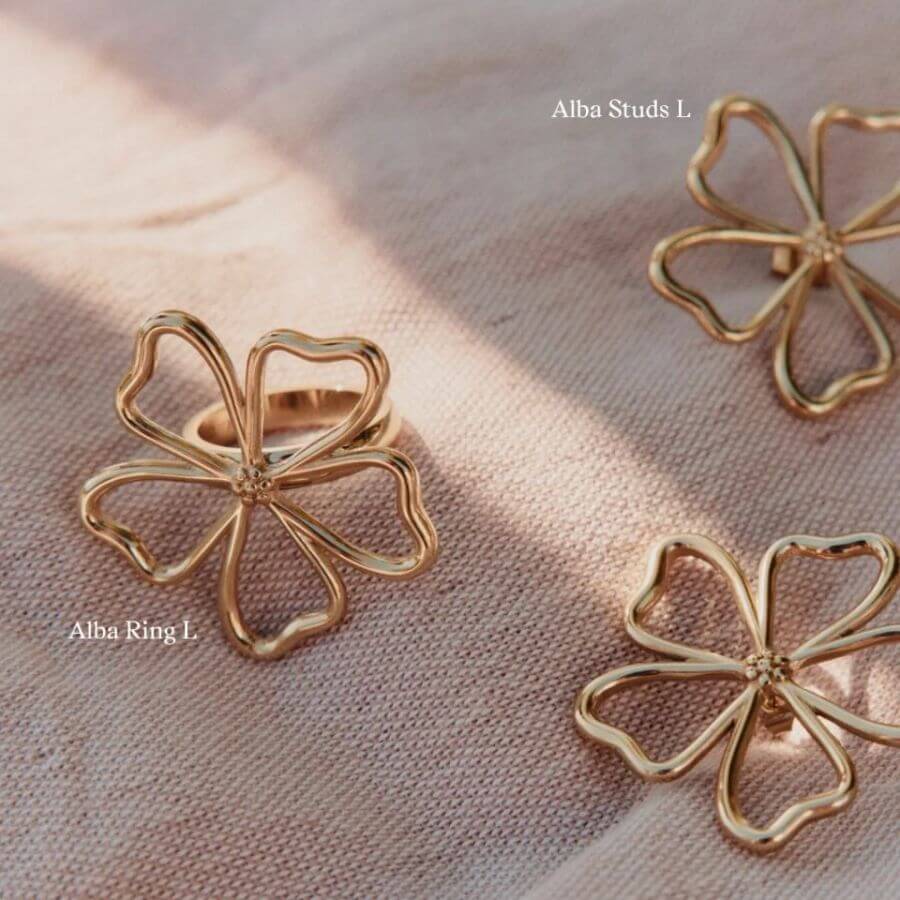 Edblad 132121 ihastuttaa Alban sarjan tunnistettavalla kukkadesignilla, jossa pehmeät muodot ja selkeä linjakkuus yhdistyvät moderniksi kokonaisuudeksi. Suurempi koko antaa korvakoruille näyttävyyttä ja tekee niistä upean yksityiskohdan niin arkeen kuin juhlavampiin hetkiin. Tyylitelty kukka tuo mieleen auringon lämmön ja kesäisen huolettomuuden, ja kiiltävä 14 karaatin kultaus korostaa korun valoisaa ja viimeisteltyä ilmettä. Nappimallinen kiinnitys tekee korvakoruista miellyttävät käyttää, ja niiden muotoilu asettuu kauniisti korvalehteä vasten. Korvakorut toimivat näyttävästi yksinään, mutta ne on helppo yhdistää myös saman sarjan kookkaaseen sormukseen yhtenäisen tyylin luomiseksi.