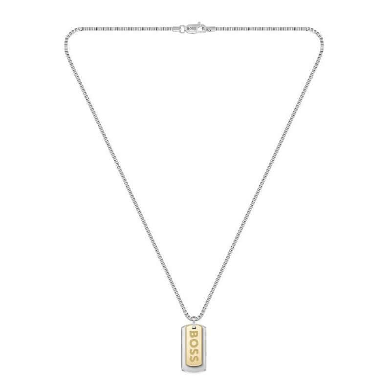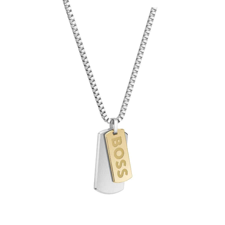 - Kaulaketjussa riippuu kaksi laattaa, joista toiseen on kaiverrettu Boss logo.
