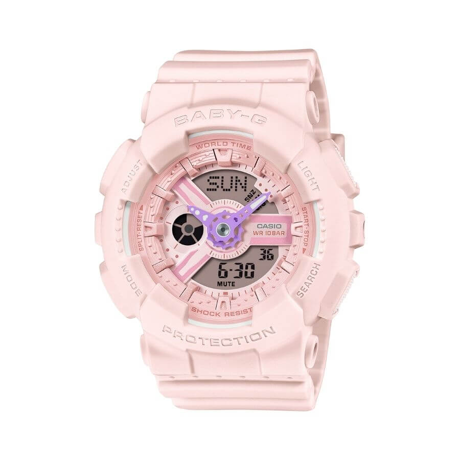 Casio Baby-G Rannekello BA-110AH-4AER Limited Edition yhdistää pehmeän pastellivärimaailman ja rohkean, teknisen muotoilun moderniksi kokonaisuudeksi. Tämä erikoismalli on suunniteltu aktiiviseen arkeen, jossa tyyli ja kestävyys kulkevat käsi kädessä.
