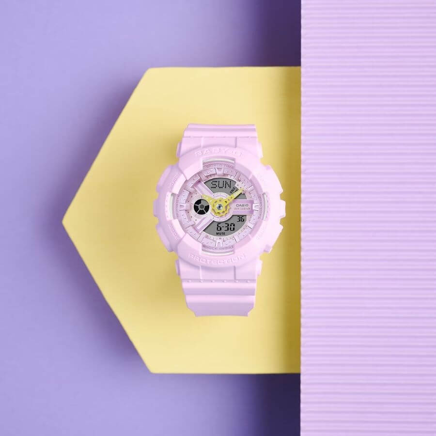 Casio Baby-G BA-110AH-6AER perustuu ikoniseen BA-110-malliin, joka tunnetaan moniulotteisesta ja teknisestä kellotaulustaan. Tässä Limited Edition -versiossa kellon yksityiskohtainen rakenne – taulu, indeksit ja kerrokselliset elementit – on puettu hillittyihin pastelliväreihin. Vastapainoksi viisarien kirkkaammat värikorostukset tuovat ilmeeseen eloisuutta ja raikkautta. Kokonaisuus on tasapainoinen: samaan aikaan pehmeä, moderni ja itsevarma.