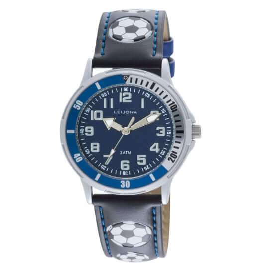 - Leijona Jalkapallo Lasten kello 5223-782 jossa on 16 mm leveä musta-sininen nahkaranneke jalkapallon kuvilla.