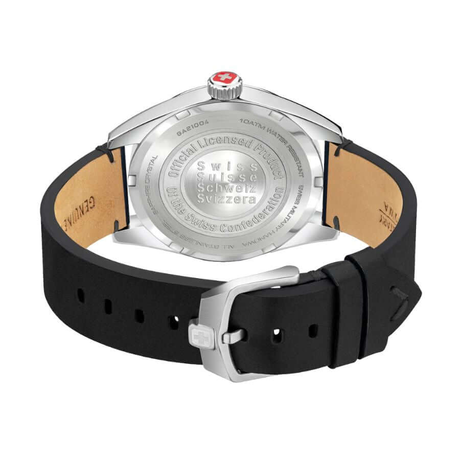 Swiss Military Hanowa SMWGA2100401 kellon sydämenä tikittää tarkka Swiss Made Ronda 503 -kvartsikoneisto. 42 mm teräskuori, safiirilasi ja 100 metrin vesitiiviys tekevät siitä kestävän kumppanin, kun taas nahkaranneke viimeistelee kokonaisuuden hienostuneella otteella.