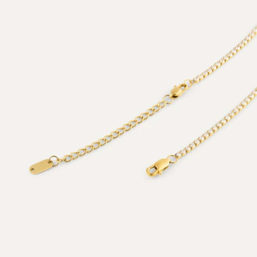 Materiaalina on laadukas ruostumaton teräs, joka on viimeistelty 18K kullan sävyisellä PVD-pinnoitteella. Tämä tekee korusta kestävän ja pitkäikäisen valinnan, joka säilyttää kauniin värinsä käytössä. Cubic zirconia -kivet tuovat ylellistä kimallusta ja viimeisteltyä ilmettä. Säädettävä ketjun pituus mahdollistaa istuvuuden eri kaula-aukoille ja antaa joustavuutta stailaukseen.