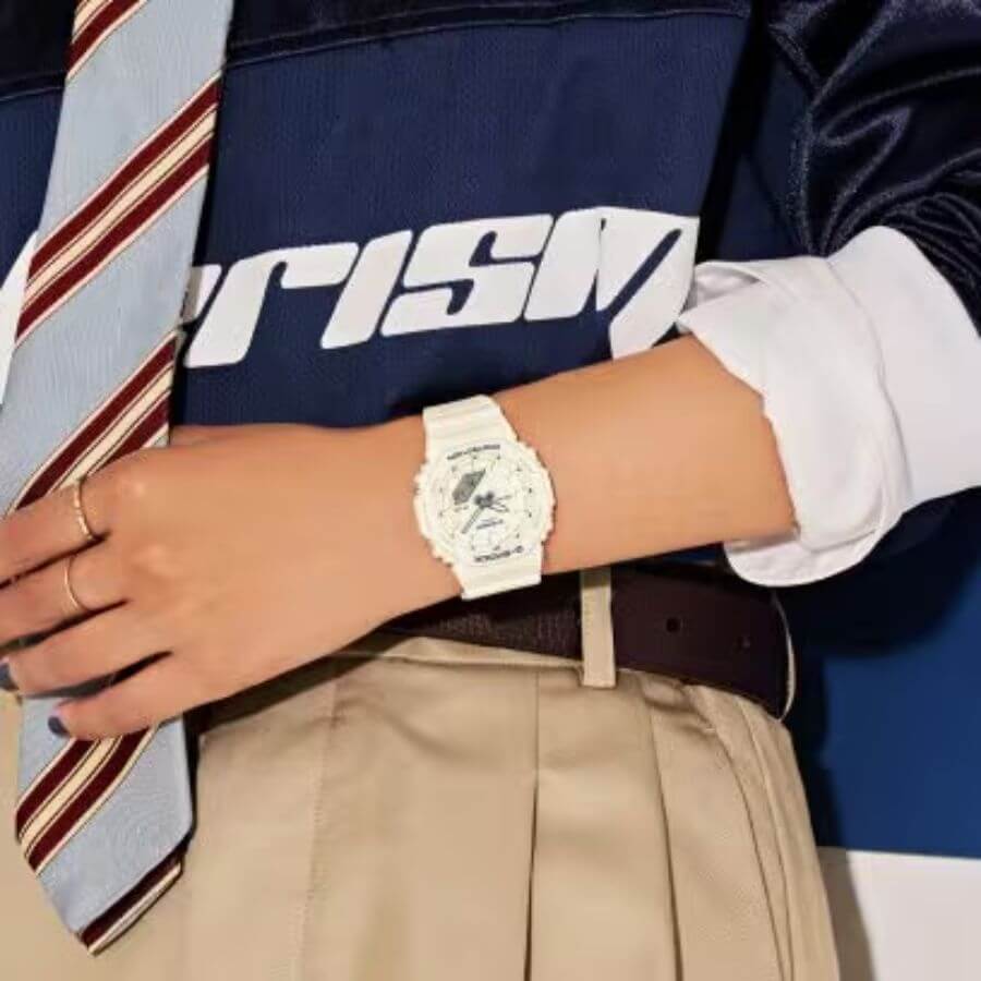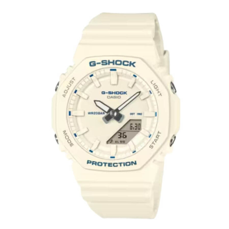 Casio G-Shock Rannekello GMA-P2100BA-7AER tuo ranteeseen raikkaan ja modernin ilmeen, jossa minimalistinen muotoilu kohtaa hienovaraisen värillisen yksityiskohdan. Ivory white -sävyinen kokonaisuus on kevyt ja ajaton, ja siniset aksentit tuovat siihen juuri sopivasti leikkisyyttä ja persoonallisuutta arjen tyyliin.