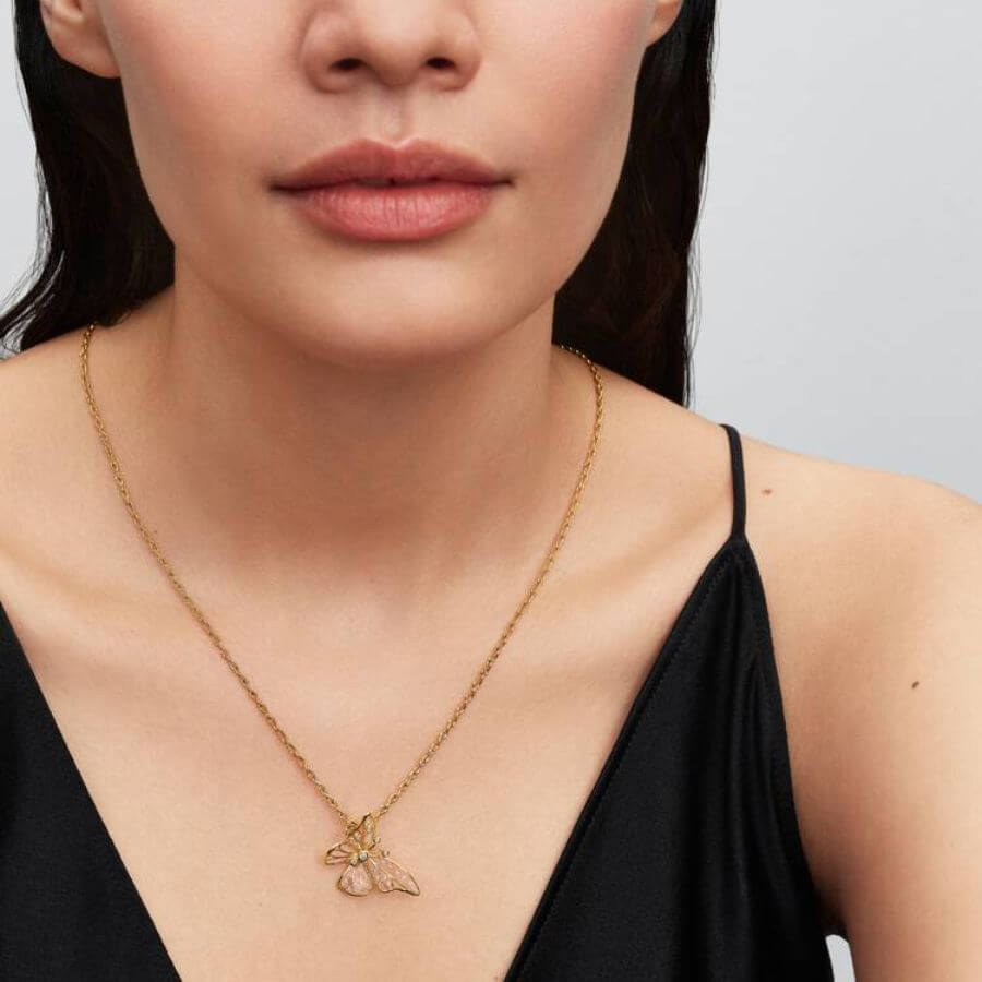 Pandora 764487C01 hurmaa siroilla mutta näyttävillä yksityiskohdillaan. Perhosen siivet on toteutettu avoimella rakenteella, ja niiden pinnoilla yhdistyvät kirkas UV-hartsi ja säihkyvät kuutiolliset zirkoniat. Keskelle istutettu kivi korostaa muotoilua ja tuo tasapainoa kokonaisuuteen. 14 karaatin kullattu pinta antaa korulle lämpimän ja ylellisen sävyn, joka hehkuu kauniisti valossa.