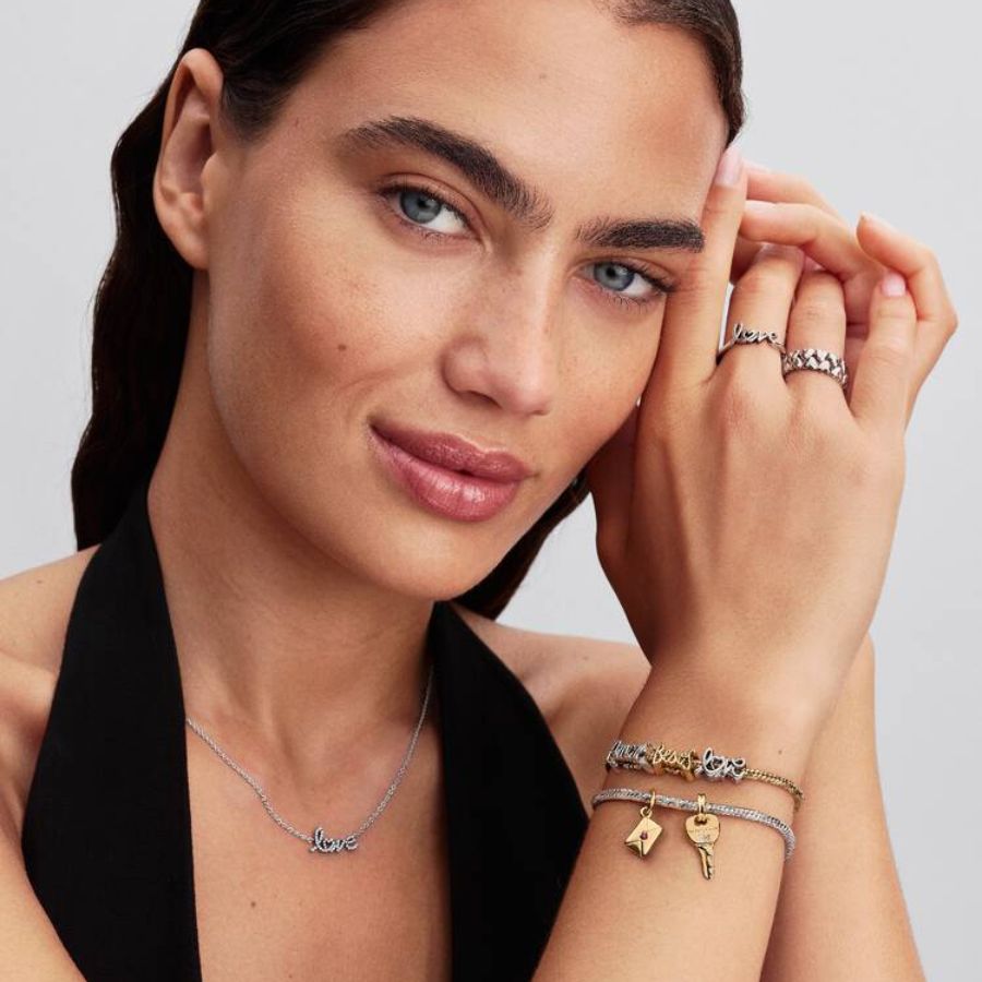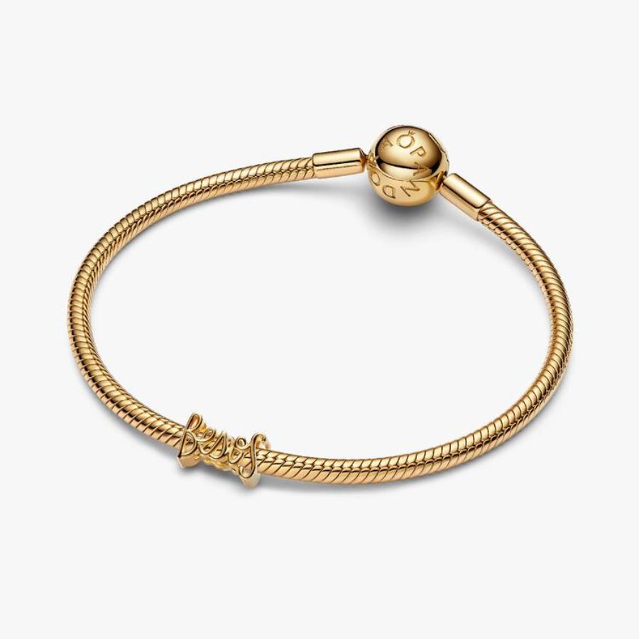 Pandora 764422C00 hurmaa sen virtaavalla, kolmiulotteisella muotoilulla. Kirjainten pyöreät linjat ja pehmeä rytmi tuovat helaan lämpöä, ja 14 karaatin kullalla päällystetty pinta hehkuu elegantisti valossa. Koru toimii kuin pieni viesti — hellyydenosoitus, jonka voi kantaa mukana joka päivä. Sen sileä ja kiiltävä viimeistely tekee helasta ylellisen mutta helposti yhdisteltävän osan Pandora Moments -korukokonaisuuksia.