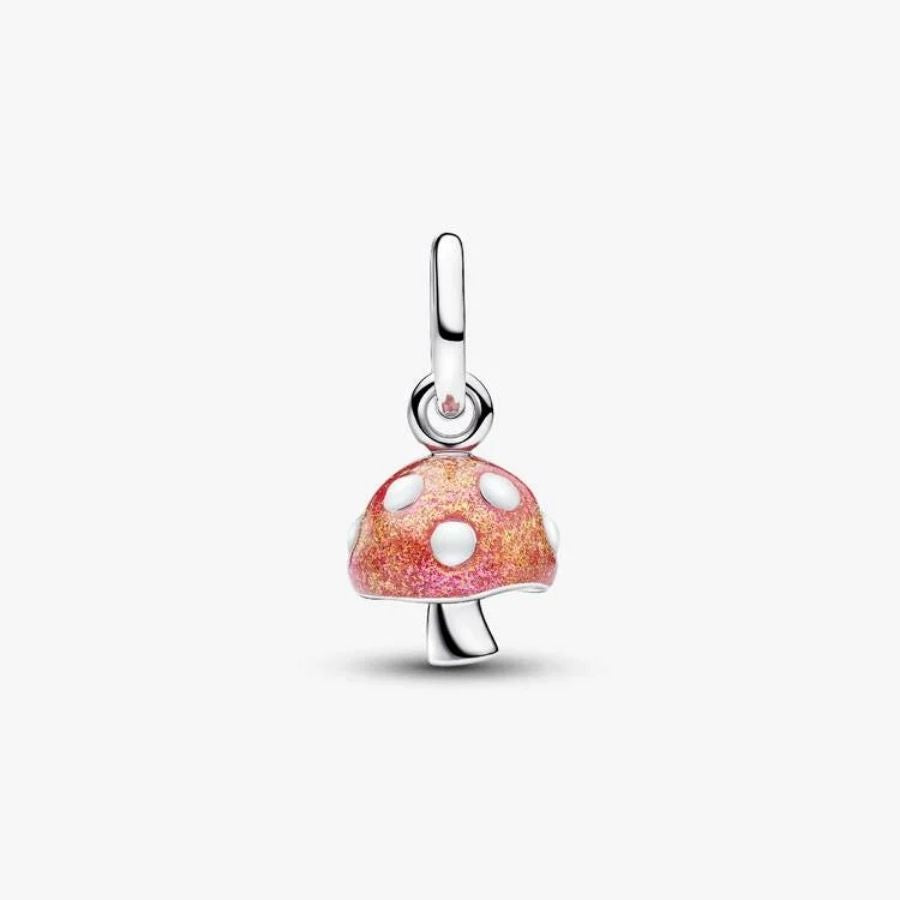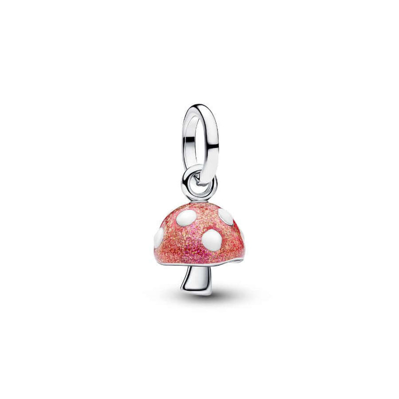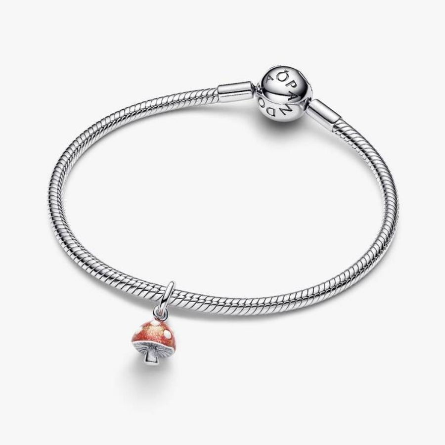 Pandora 794376C01 hurmaa suloisella sienimuotoilullaan, jossa yhdistyvät käsityön tarkkuus ja rohkea värien käyttö. Sienen lakki on viimeistelty kimaltelevalla punaisella emaloinnilla, jota täydentävät pimeässä hohtavat valkoiset yksityiskohdat. Valon sammuttua hela paljastaa uuden puolensa ja hehkuu lempeästi, luoden korun käyttöön hauskan ja ainutlaatuisen elementin. Riippuva dangle-muoto tuo rannekoruun liikettä ja eloisuutta.