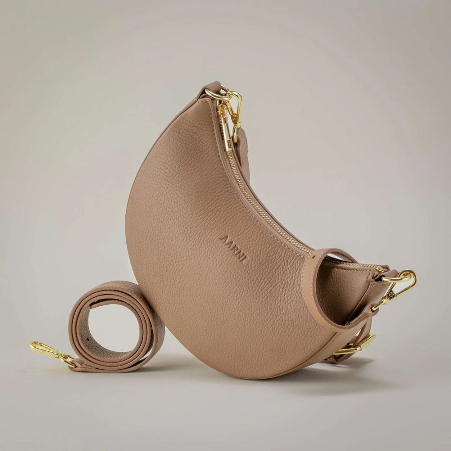 Aarni Luna tunnetaan monikäyttöisyydestään ja tyylikkyydestään. Laukun puolikuun muotoinen siluetti myötäilee kauniisti vartaloa ja sopii täydellisesti niin arjen menoihin kuin iltamenoihin. Mukana tuleva kaksiosainen olkahihna antaa mahdollisuuden kantaa laukkua monella eri tavalla – crossbody-tyyliin tai lyhyempänä olkalaukkuna.