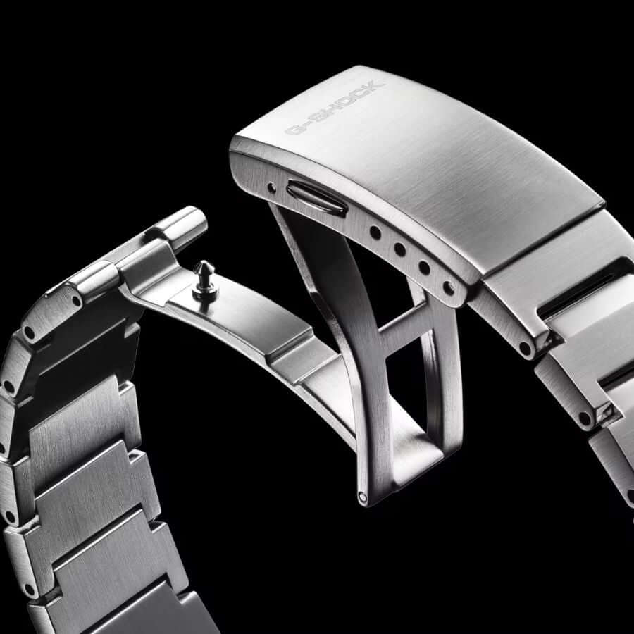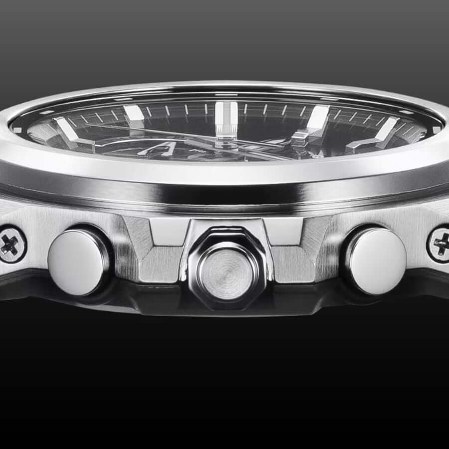 Casio GST-B1000D-1AER jatkaa G-SHOCKin perinnettä, mutta uudistaa sen minimalistiseen ja terävään muotoiluun. Kiillotetun teräksen ja hiilikuiturakenteen yhdistelmä luo hienostuneen ja kestävän kokonaisuuden. Kuoren kolme erilaista viimeistelyä – pystysuuntainen harjaus, pyöröhionta ja peilikiillotus – tuovat pintaan dynaamista syvyyttä, joka elää valon mukana. Logoista riisuttu kehys ja virtaviivainen muoto antavat kellolle modernin, hillityn ilmeen.