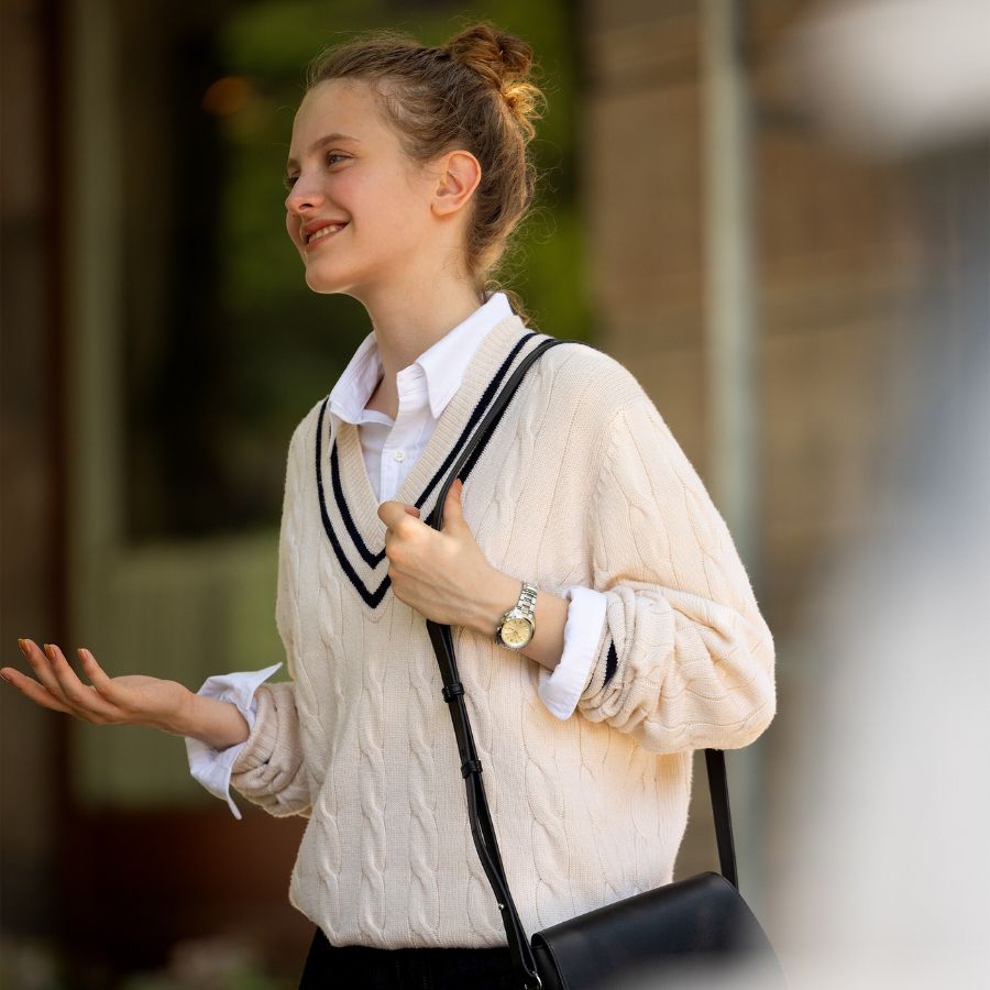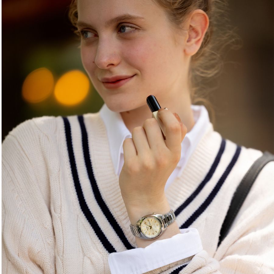 Seiko SRE023K1 SNXS “Double Cream” -malli hurmaa lämpimällä samppanjanvärisellä kellotaulullaan, jota koristavat kullansävyiset yksityiskohdat. Ne hehkuvat valossa pehmeästi ja tuovat kelloon eleganttia naisellisuutta. Selkeät LumiBrite-osoittimet ja -indeksit takaavat erinomaisen luettavuuden kaikissa valaistusolosuhteissa.