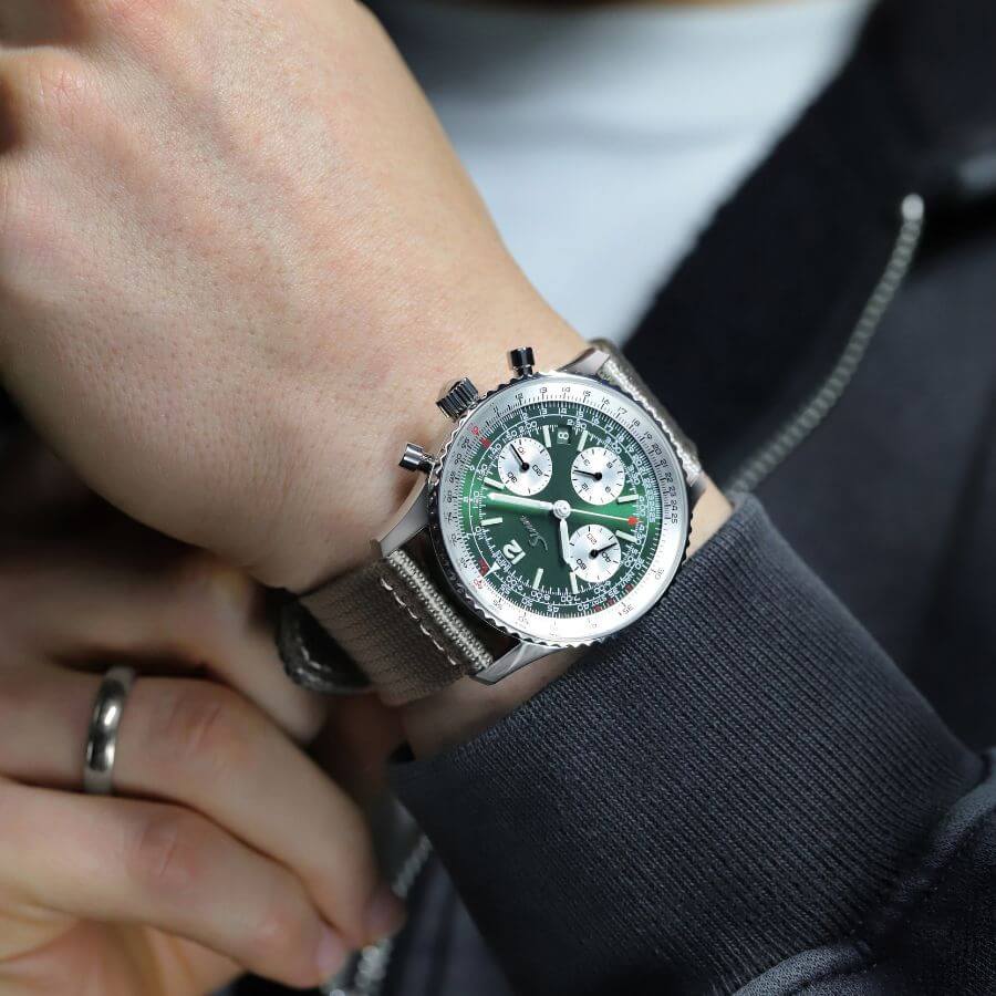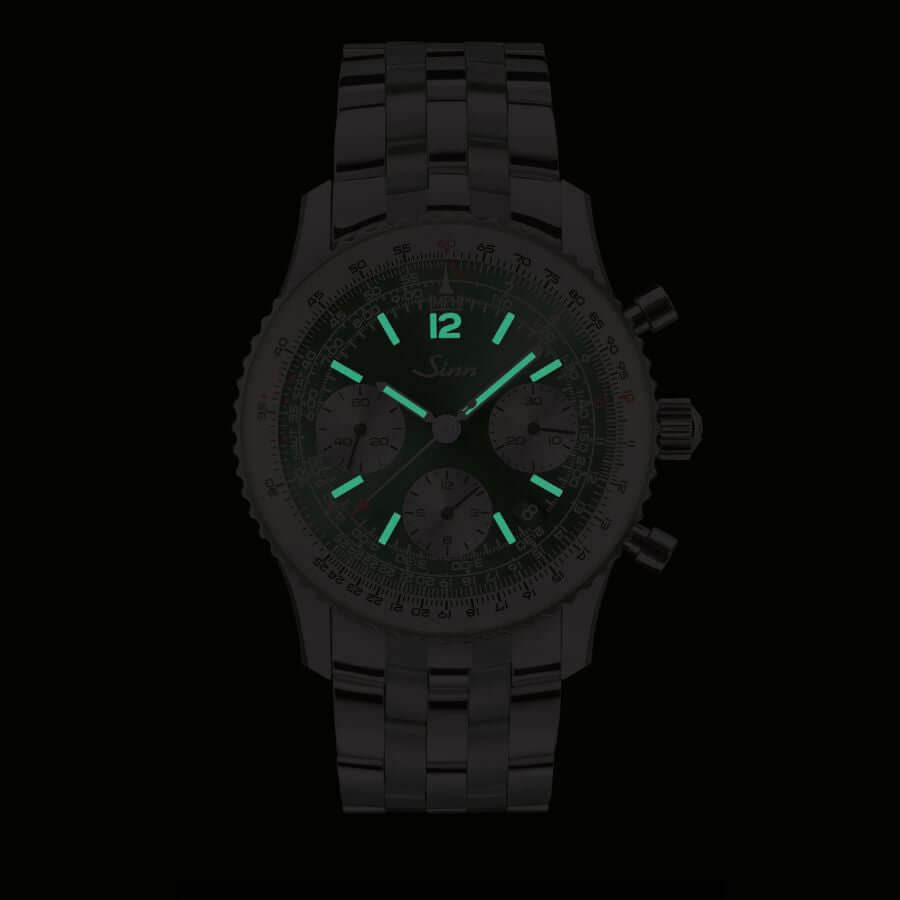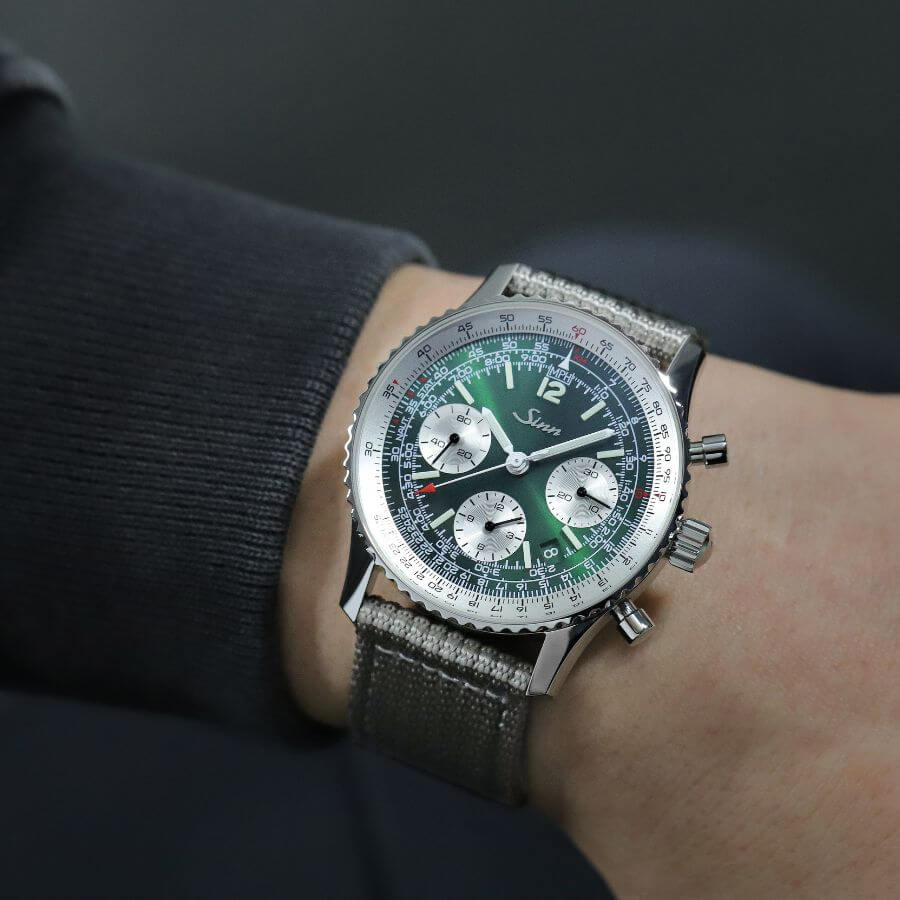 Sinn 903.093 edustaa 903-mallisarjan jatkuvaa kehitystä, jossa visuaaliset yksityiskohdat viimeistelevät teknisen kokonaisuuden. Vihreä kellotaulu heijastaa valoa elävästi ja tuo tauluun syvyyttä eri valaistuksissa. Galvaanisesti hopeoidut apunäytöt tricompax-asettelussa korostavat klassista kronografin ilmettä. Logaritmisella asteikolla varustettu pyörivä liukusääntökehä mahdollistaa tarkat laskutoimitukset – kuten ajan, matkan ja valuuttamuunnosten määrittämisen – suoraan ranteesta.