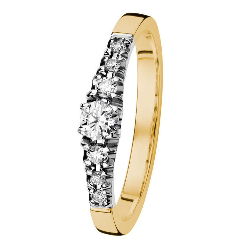 - Sormuksen keskelle on istutettu 0,14 ct timanti ja kapenevaan runkoon reunoilla pienentyvät timantit.