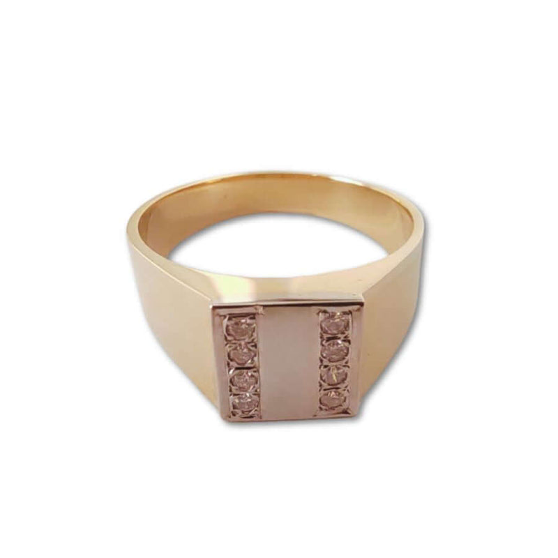 Kultainen kantasormus timanteilla Upea kullan värinen kantasormus on koristeltu kahdeksalla timantilla. Timantit on istutettu sormuksen kantaosan molemmille reunoilla. Sormus on alhaalta 3 mm leveä ja kantaosan kohdalta 8 mm leveä. Sormus on valmistettu laadukkaasta 14 karaatin kullasta.