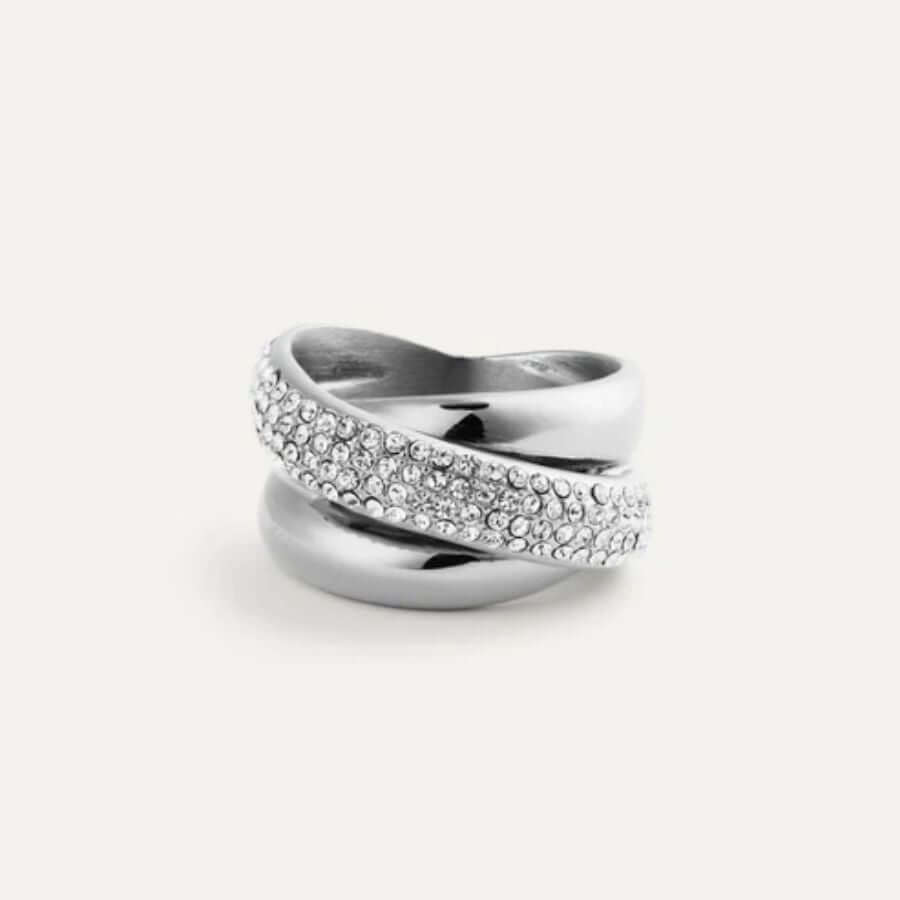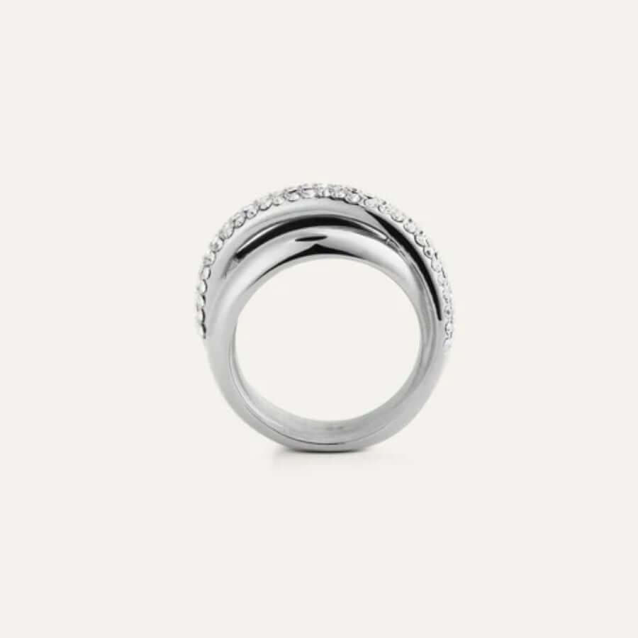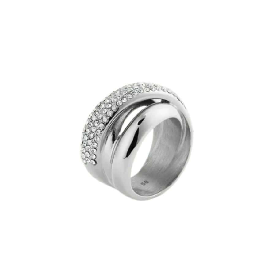 Sormus on valmistettu kestävästä teräksestä, joka takaa miellyttävän tuntuman ja pitkäikäisen käytön. Tarkasti kiillotettu pinta heijastaa valoa kauniisti, ja pavé-kivet lisäävät siihen pehmeää mutta runsasta säihkettä. Saatavilla olevat koot 50–60 varmistavat sopivan istuvuuden, ja leveä, miellyttävä sisäpinta tekee sormuksesta mukavan käyttää koko päivän.