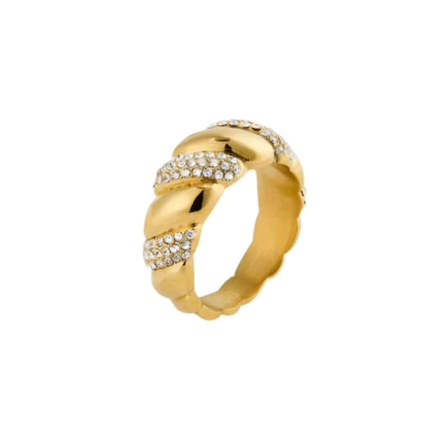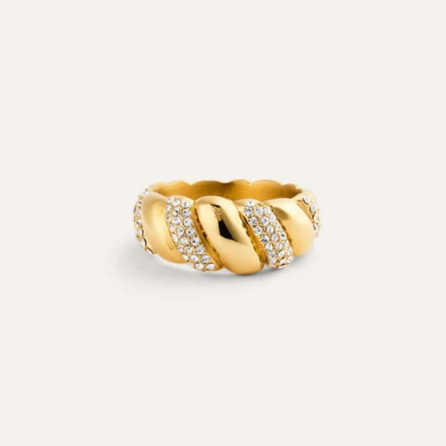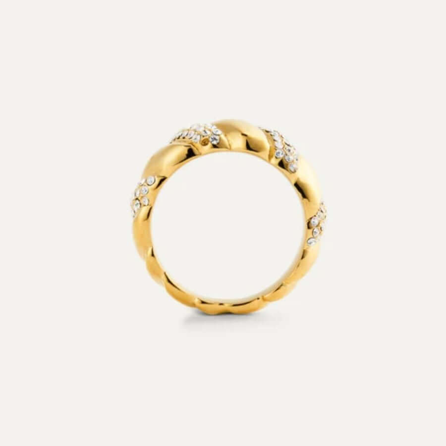 Mockberg MB1860 jatkaa brändin orgaanista, veistoksellista muotokieltä. Kierteinen profiili antaa sormukselle elävän ja kolmiulotteisen vaikutelman, ja kivillä koristellut osiot tuovat siihen rytmiä ja valon kauniisti vangitsevaa säihkettä. Sileän metallin ja pavé-koristelun vuorottelu tekee mallista tasapainoisen ja viimeistellyn, kun taas lämmin kullansävy pehmentää kokonaisuutta ja antaa sormukselle elegantin, helposti yhdisteltävän ilmeen.