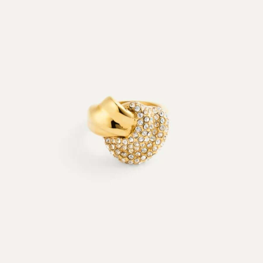 Mockberg Soirée Sormus MB1884 yhdistää veistoksellisen muotoilun ja lämpimän kullanhehkun näyttäväksi kokonaisuudeksi, joka herättää huomiota pehmeällä eleganssillaan. Sormuksen muoto on rohkea mutta harmoninen – se asettuu kädelle kuin pieni taideteos, jonka runsas Preciosa-kivien säihke heijastaa valoa jokaisella liikkeellä.