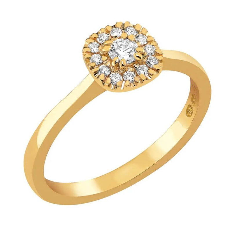• Sandberg V-704 sormuksen keskitimantti on 0,07 ct, jota kehystää kaksitoista pienempää timanttia.
