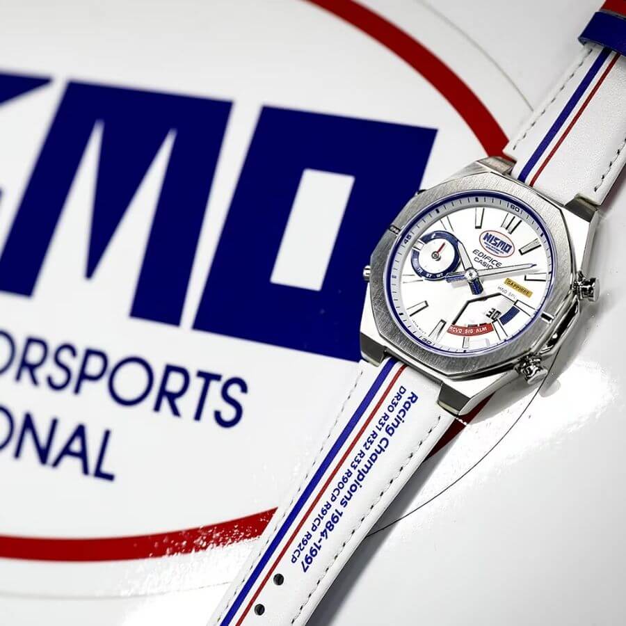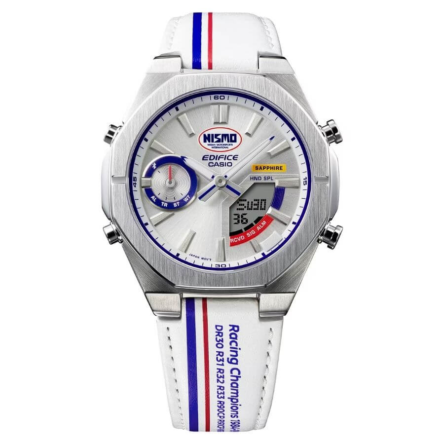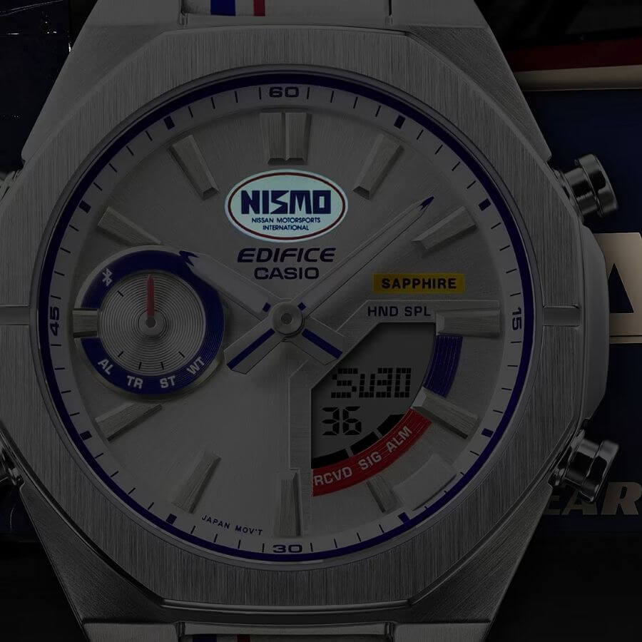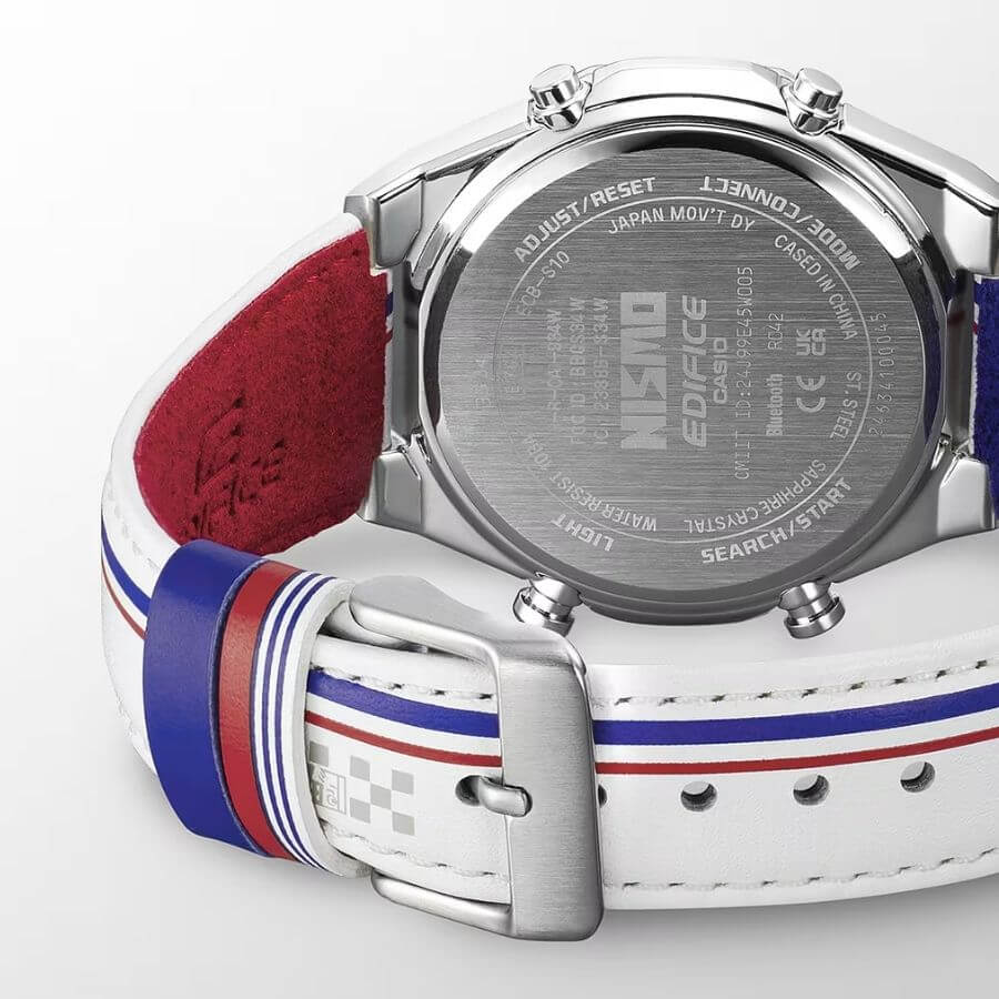 Casio ECB-S10NIS-7AER on syntynyt Casion, Nissanin ja NISMO:n ainutlaatuisessa yhteistyössä. Kellon muotoilu ammentaa inspiraationsa NISMO:n historiasta vuodesta 1984 alkaen. Kellotaulussa ja rannekkeessa toistuva NISMO:n ikoninen kolmivärinen värimaailma – punainen, sininen ja valkoinen – tekee kokonaisuudesta urheilullisen mutta harkitun. Alkuperäinen NISMO-logo kellotaulun yläosassa hohtaa pimeässä viitaten legendaarisiin yökilpailuihin, ja tauluun lisätty yksityiskohta Nissan Skyline R32:n oranssista tuulilasibannerista viimeistelee designin. Rannekkeeseen painetut NISMO-mestareiden nimet vuosilta 1984–1997 kertovat tarinaa tiimistä ja sen saavutuksista.