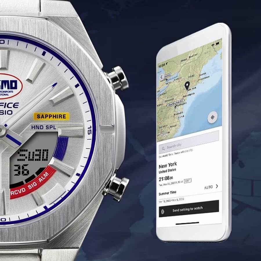 Käytännöllisyys kulkee käsi kädessä tyylin kanssa. Bluetooth®-yhteys mahdollistaa tarkan ajan synkronoinnin älypuhelimen kanssa CASIO WATCHES -sovelluksen avulla. Maailmanaika, ajanotto, ajastin ja hälytykset tekevät kellosta erinomaisen kumppanin niin arkeen kuin vapaa-aikaan. Kello toimii yhtä hyvin yksinään kuin osana urheilullista tai smart casual -tyyliä.