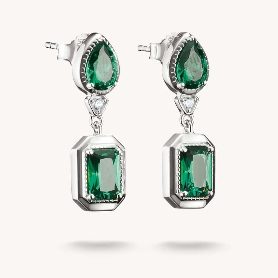 Thomas Sabo H2334-166-6 -korvakorujen muotoilu perustuu pystysuuntaiseen sommitteluun ja eri hiontojen vuoropuheluun. Yläosassa oleva smaragdinvihreä pisaranmuotoinen lasikeramiikkakivi yhdistyy sen alapuolella olevaan oktaagonin muotoiseen kiveen, luoden koruihin modernin ja graafisen siluetin. Kivien väliin asetettu pieni, pyöreä valkoinen zirkonia heijastaa valoa kauniisti ja tuo kokonaisuuteen hienovaraista kirkkautta. Hopeanvärinen viimeistely korostaa vihreiden kivien syvyyttä ja antaa koruille ajattoman ilmeen.