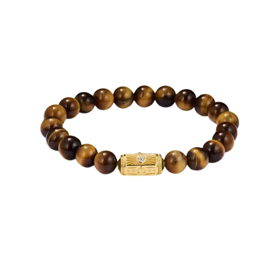 Thomas Sabo Tiger's Eye Rannekorut A2212-324-2-L17 jonka muotoilu rakentuu pyöreistä, huolellisesti kiillotetuista tiikerinsilmähelmistä, joiden luonnollinen säihke tuo koruun rauhallista syvyyttä. Rannekorun keskellä oleva fasetoitu helmi on valmistettu kierrätetystä 925 sterlinghopeasta ja viimeistelty ylellisellä 18 karaatin kultauksella. Keskushelmeen kaiverretut onnen symbolit – hevosenkenkä, puolikuu ja silmä – sekä THOMAS SABO- ja LUCK-tekstit vahvistavat korun talismaanimaisen luonteen ja antavat sille henkilökohtaisen merkityksen.