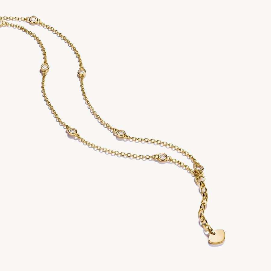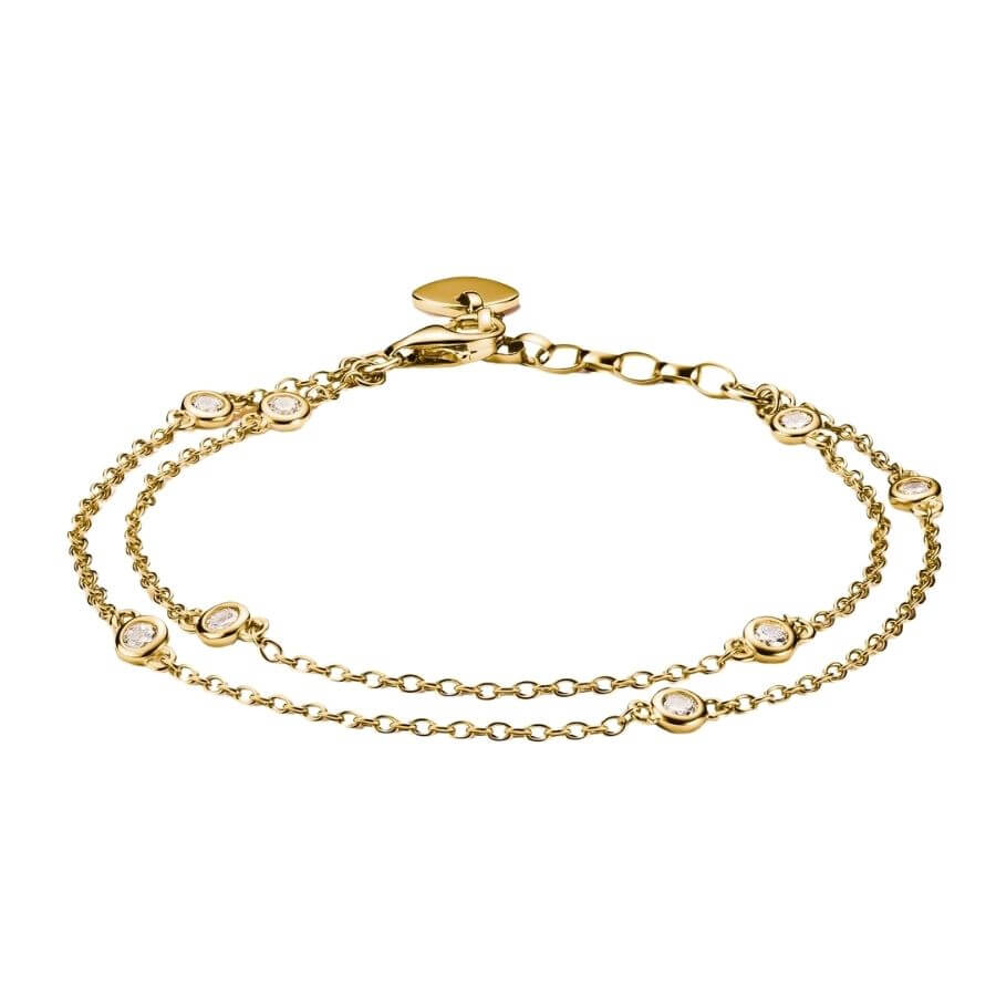 Thomas Sabo A2216-414-14 -rannekorun muotoilu perustuu kahteen siroon ketjuun, joita rytmittävät huolellisesti asetellut valkoiset zirkoniakivet. Kivien hienovarainen kimallus tuo koruun elävyyttä ilman liiallista näyttävyyttä, ja keltakullan sävyinen pinta luo lämpimän ja viimeistellyn ilmeen. Boheemi inspiraatio näkyy kevyessä ja ilmavassa kokonaisuudessa, joka istuu kauniisti ranteeseen.