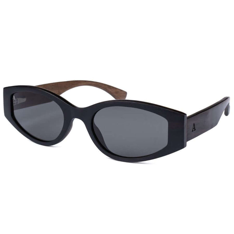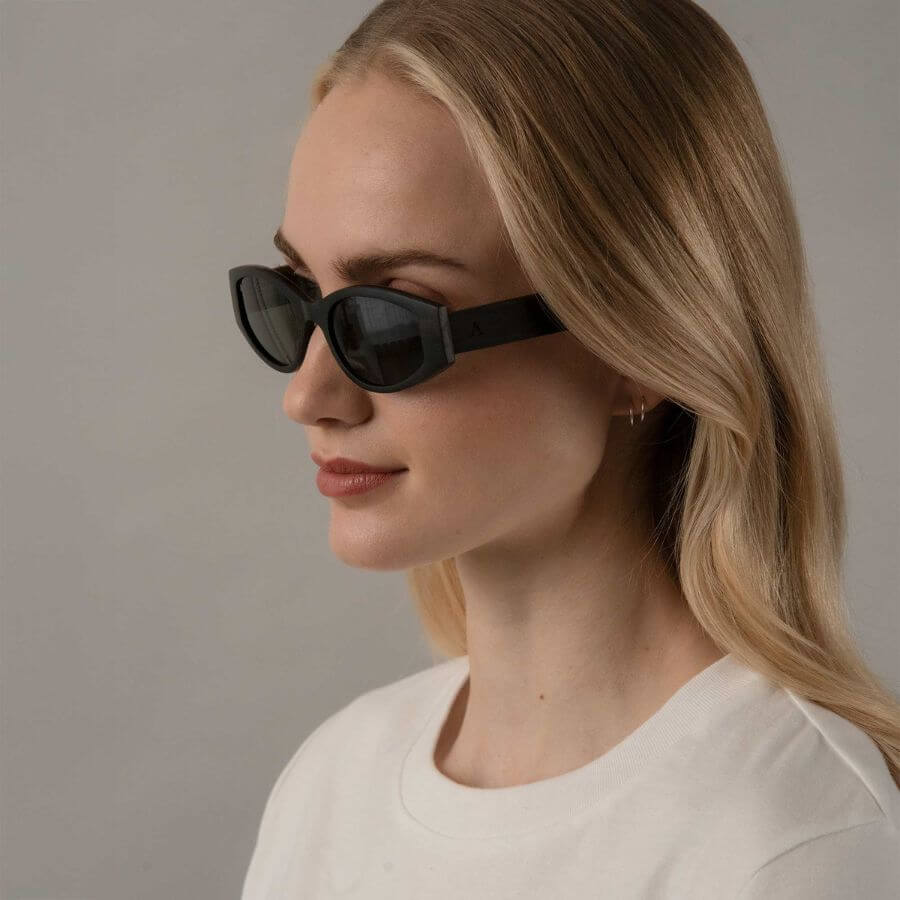 Kehykset valmistetaan arvokkaasta eebenpuusta, jonka syvä ja tumma sävy tekee laseista elegantit ja viimeistellyt. Kehysten sisällä kulkeva Carbon Core™ -rakenne, eli hiilikuituydin puuviilujen välissä, lisää kestävyyttä ja tekee laseista samalla erittäin kevyet. Jousitetut metallisaranat parantavat käyttömukavuutta ja joustavuutta, jolloin lasit istuvat mukavasti myös pitkässä käytössä. Polarisoidut premium-polykarbonaattilinssit tarjoavat 100 % UV-suojan ja vähentävät häikäisyä kirkkaassa auringonvalossa. Tummanharmaat linssit viimeistelevät tyylikkään kokonaisuuden.