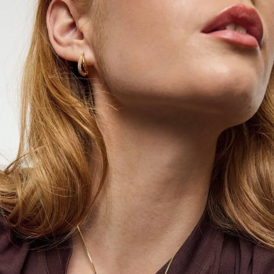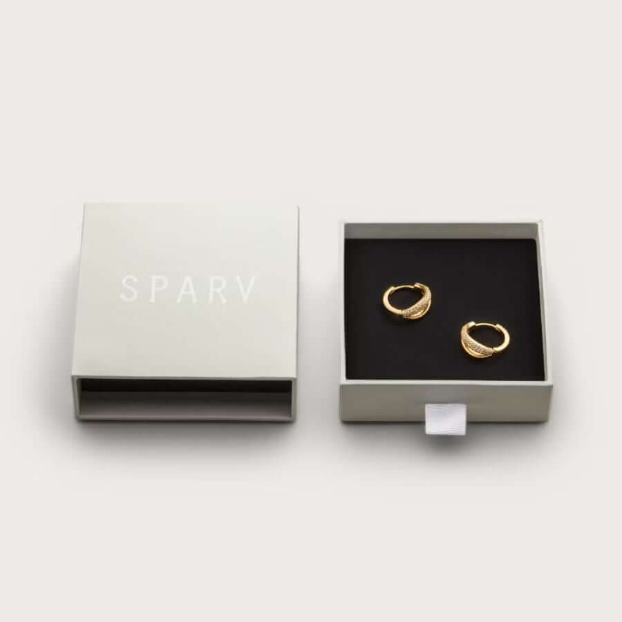 Sparv 13000101 -korvakoruissa yhdistyvät skandinaavinen selkeys ja harkittu muotokieli. Korvakorujen kaksinkertainen rengasrakenne tekee niistä näyttävät mutta samalla monikäyttöiset. Runsas chunky-muotoilu tuo koruihin modernia ilmettä, kun taas pavé-tyylisesti istutetut zirkoniat luovat tasaisen ja kauniisti heijastavan säihkeen. Korvakorujen lämmin kullan sävy korostaa korun ylellistä ilmettä ja tekee siitä helposti yhdisteltävän sekä klassisiin että trendikkäisiin asukokonaisuuksiin.
