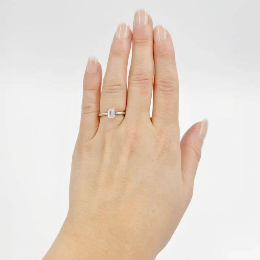 North Emerald cut -malli on suunniteltu sinulle, joka pidät suorista linjoista ja modernista muotoilusta. Yksikivinen sormus toimii kauniisti sellaisenaan, mutta on myös helppo yhdistää North-sarjan allianssisormuksiin yhtenäisen ja tyylikkään kokonaisuuden luomiseksi.