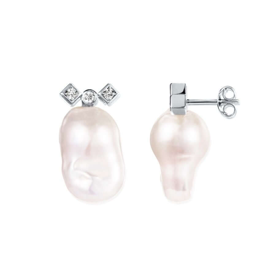 Efva Attling 12-102-02380 -korvakorujen yläosassa kimaltelevat timantit, jotka on istutettu selkeään ja moderniin riviin: kaksi princess-hiottua timanttia (yht. 0,20 ct) sekä yksi briljanttihiottu timantti (0,06 ct). Ne muodostavat geometrisen, säteilevän kruunun 18 karaatin valkokultaan. Näiden alla riippuu kaunis barokki makeanvedenhelmi, jonka koko (n. 18 x 11 mm) tekee jokaisesta koruparista täysin uniikin. Helmien orgaaninen muoto ja pehmeä hohde tuovat koruihin elävyyttä ja kontrastia timanttien kirkkaalle loistolle.