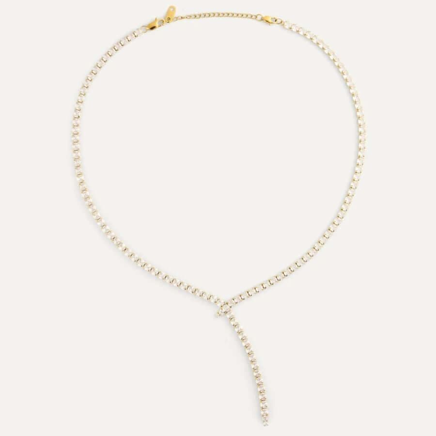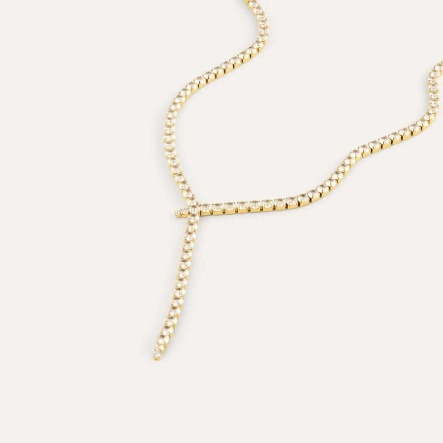 Mockberg MB1930 edustaa brändille ominaista minimalistista eleganssia, jossa jokainen yksityiskohta on tarkkaan mietitty. Y-mallinen muoto laskeutuu kauniisti kaulalle ja luo kevyen, ilmavan ilmeen, joka korostaa kaulan luonnollista linjaa. Kullanvärinen pinta yhdistettynä kirkkaasti hohtaviin zirkoneihin luo modernin, mutta ajattoman vaikutelman. Solmua muistuttava kohta korussa tekee siitä persoonallisen, ja sen siro muoto tekee yhdistämisestä helppoa – koru toimii upeasti niin yksin kuin muiden kaulakorujen rinnalla.
