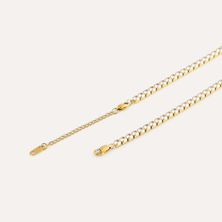 Mockberg Alora Kaulakoru MB1930 hurmaa lämpimällä kullansävyllään ja selkeällä, modernilla ilmeellään. Kaulakorun siro linja ja valkoisten zirkonia -kivien rauhallinen säihke tuovat asuun hienostunutta pehmeyttä – täydellinen lisä arjen asukokonaisuuksiin ja iltojen juhlapukeutumiseen.