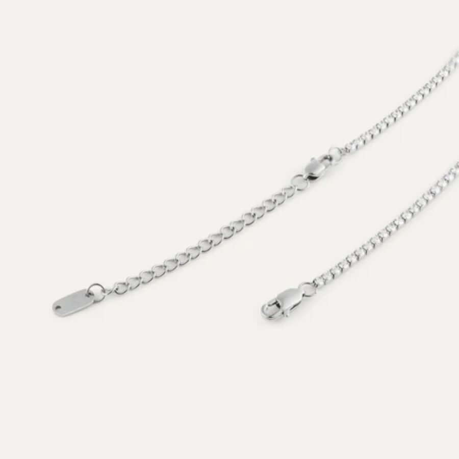 Kestävä teräsrunko takaa korulle pitkäikäisyyden ja keveyden, ja sen hopeansävy korostaa zirkonioiden viileää kimallusta luonnollisella tavalla. Säädettävä 370 + 50 mm pituus mahdollistaa täydellisen istuvuuden ja antaa vapautta stailaukseen – korua voi käyttää lyhyempänä choker-henkisesti tai pidentää sen linjakkaaksi, elegantiksi kokonaisuudeksi.