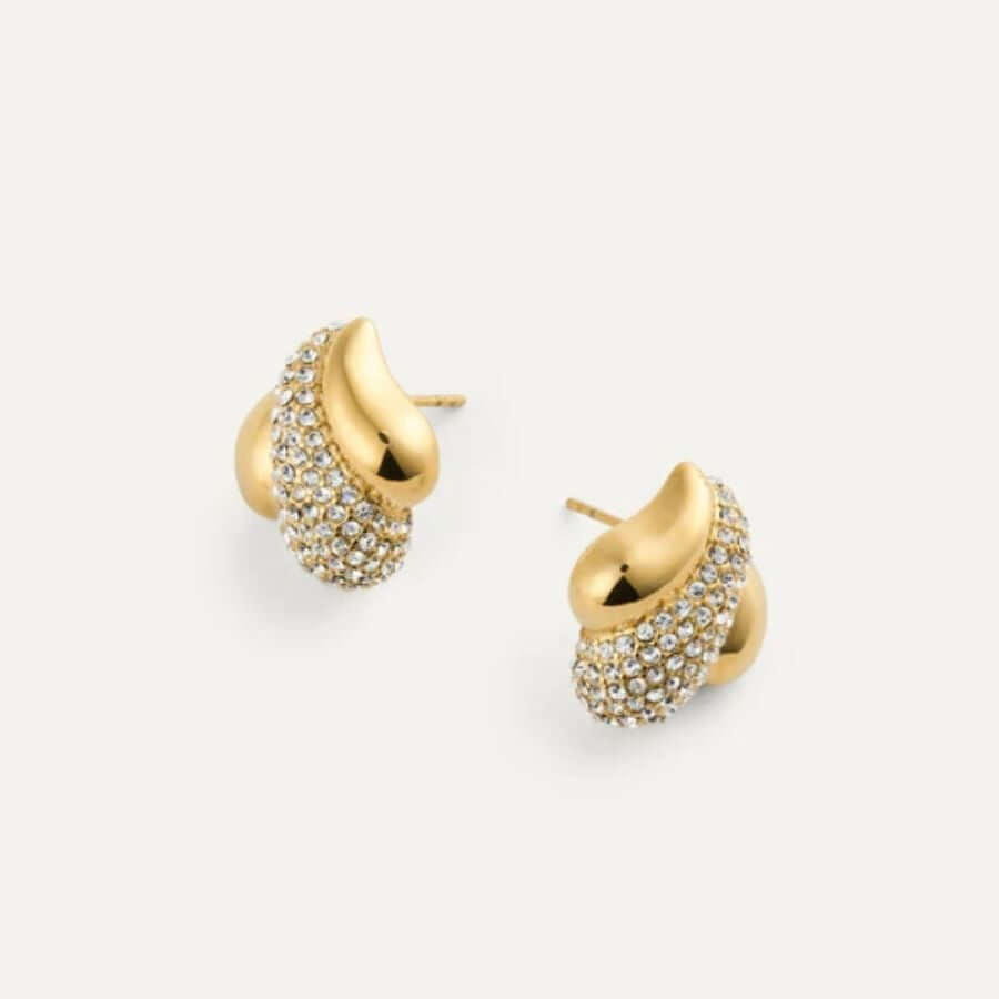 Mockberg Soirée Korvakorut MB1851 hehkuvat lämpimän kullan sävyssä ja tuovat kasvojen läheisyyteen näyttävän mutta pehmeän elegantin ilmeen. Korvakorujen orgaaninen, kauniisti kaartuva muoto syleilee valoa ja korostuu valkoisten Preciosa-kivien runsaalla pavé-säteilyllä. Lopputulos on hienostunut, harkittu ja äärimmäisen monikäyttöinen – täydellinen silloin, kun haluat tehdä vaikutuksen hillityn tyylikkäästi.