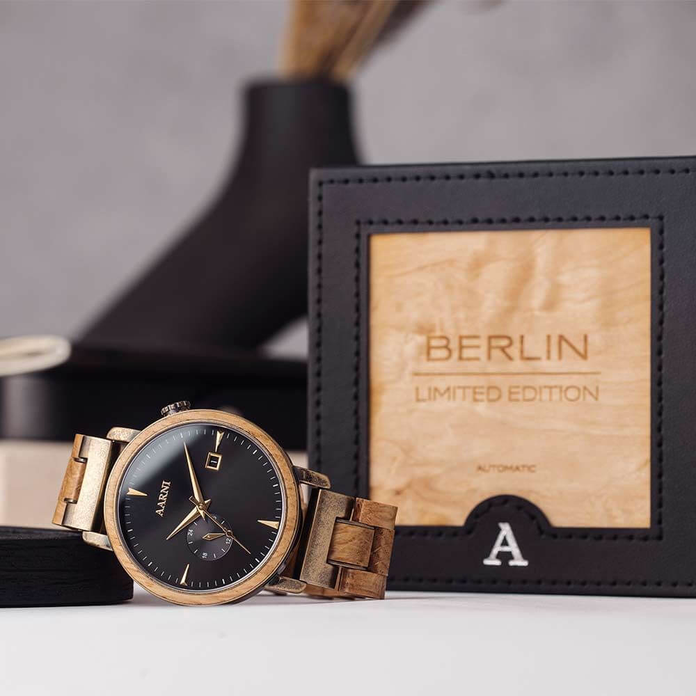 Näitä boheemeja Aarni Berlin Limited Edition- rannekelloja valmistetaan vain 300 kappaleen rajoitettu erä. Kello on aito pala Berliiniä, sillä sen puuosat on valmistettu Berliinin Wuhlheide puiston tammesta.