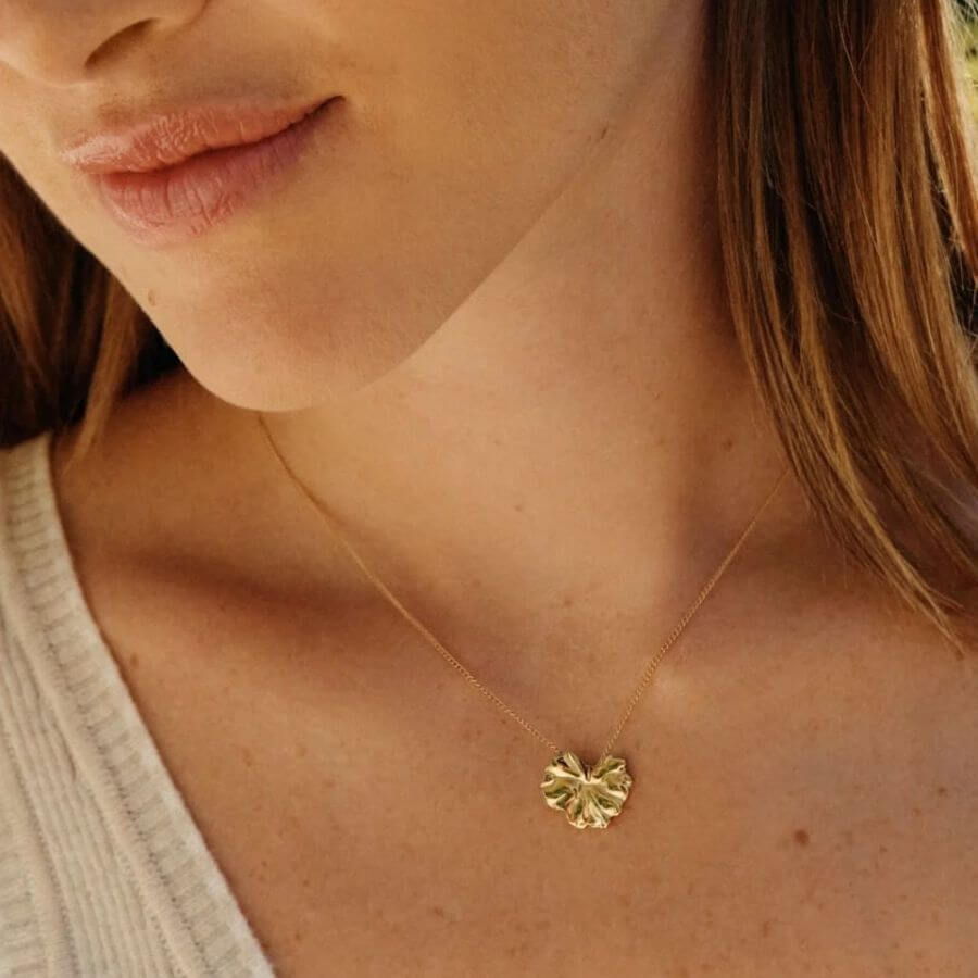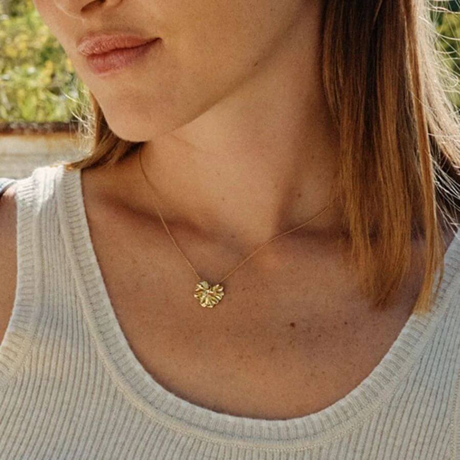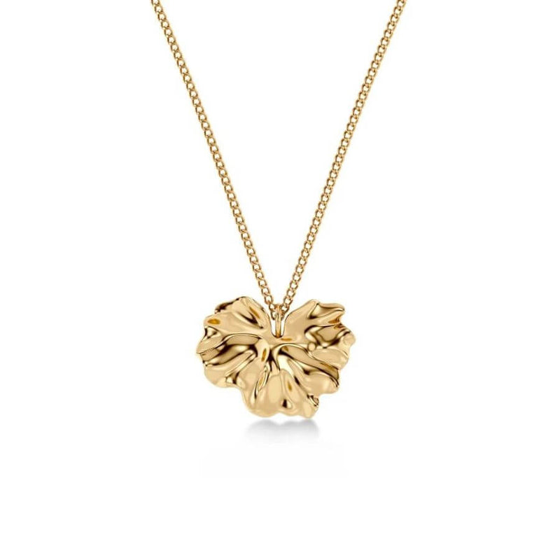Edblad 130247 kuuluu Gerana-sarjaan, jossa pääosassa ovat suuret, aaltoilevat kukan terälehdet. Tässä kaulakorussa ohut ketju kulkee kauniisti tyylitellyn kukkaelementin läpi, tehden kokonaisuudesta harmonisen ja huolellisesti viimeistellyn. Kiiltävä 14 karaatin kultaus korostaa terälehden orgaanisia muotoja ja antaa korulle ylellisen, lämpimän sävyn. Muotoilu on moderni ja selkeä, mutta samalla pehmeä ja naisellinen, mikä tekee korusta helposti yhdisteltävän eri tyyleihin.